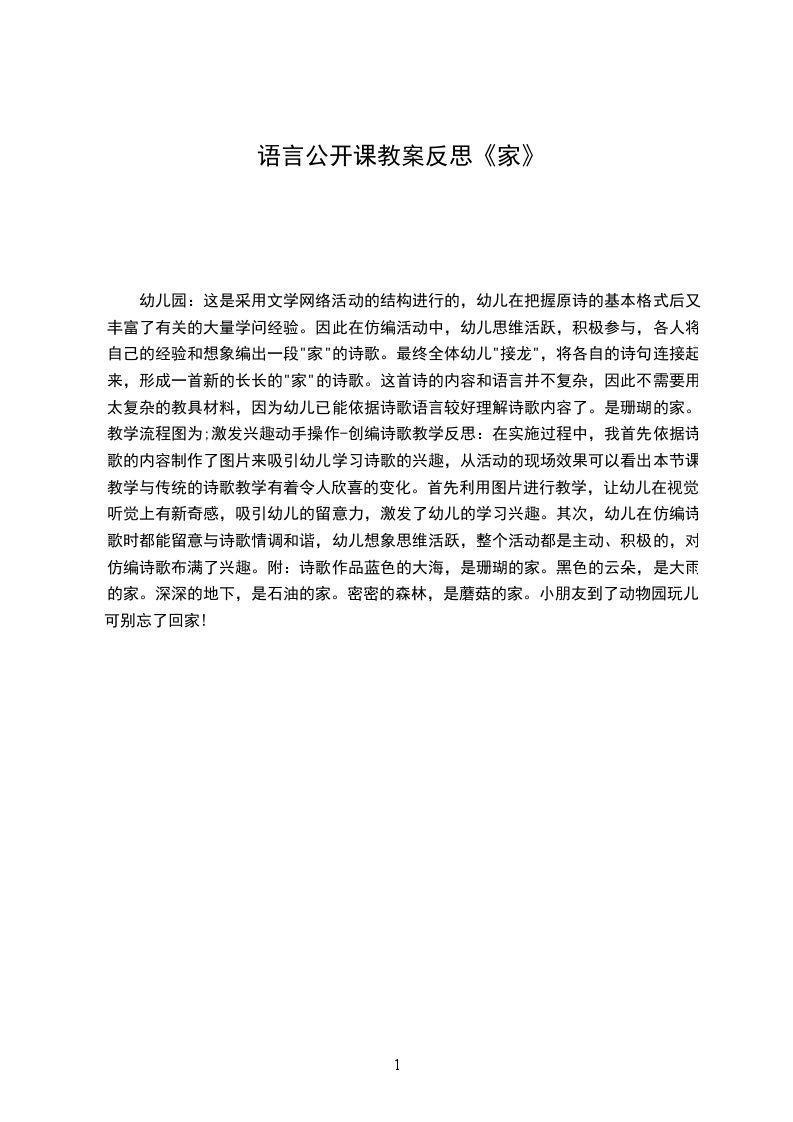 幼儿园:这是采用文学网络活动的结构进行的,幼儿在把握原诗的基本格式后又丰富了有关的大量学问经验。因此在仿编活动中,幼儿思维活跃,积极参与,各人将自己的经验和想象编出一段"家"的诗歌。最终全体幼儿"接龙",将各自的诗句连接起来,形成一首新的长长的"家"的诗歌。这首诗的内容和语言并不复杂,因此不需要用太复杂的教具材料,因为幼儿已能依据诗歌语言较好理解诗歌内容了。是珊瑚的家。教学流程图为;激发兴趣动手操作-创编诗歌教学反思:在实施过程中,我首先依据诗歌的内容制作了图片来吸引幼儿学习诗歌的兴趣,从活动的现场效果可以看出本节课教学与传统的诗歌教学有着令人欣喜的变化。首先利用图片进行教学,让幼儿在视觉、听觉上有新奇感,吸引幼儿的留意力,激发了幼儿的学习兴趣。其次,幼儿在仿编诗歌时都能留意与诗歌情调和谐,幼儿想象思维活跃,整个活动都是主动、积极的,对仿编诗歌布满了兴趣。附:诗歌作品蓝色的大海,是珊瑚的家。黑色的云朵,是大雨的家。深深的地下,是石油的家。密密的森林,是蘑菇的家。小朋友到了动物园玩儿,可别忘了回家!