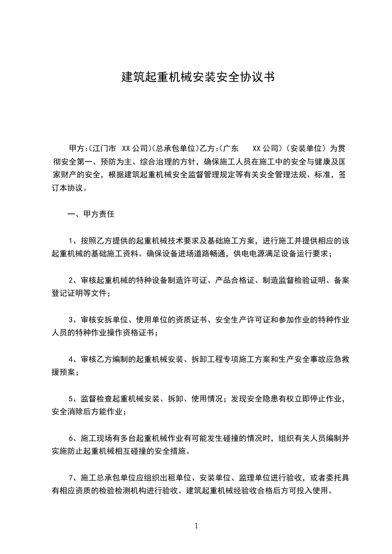 甲方:(江门市XX公司)(总承包单位)乙方:(广东XX公司)(安装单位)为贯彻安全第一、预防为主、综合治理的方针,确保施工人员在施工中的安全与健康及国家财产的安全,根据建筑起重机械安全监督管理规定等有关安全管理法规、标准,签订本协议。