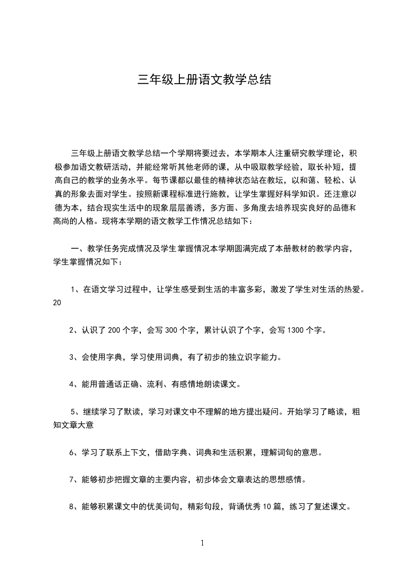 三年级上册语文教学总结一个学期将要过去,本学期本人注重研究教学理论,积极参加语文教研活动,并能经常听其他老师的课,从中吸取教学经验,取长补短,提高自己的教学的业务水平。每节课都以最佳的精神状态站在教坛,以和蔼、轻松、认真的形象去面对学生。按照新课程标准进行施教,让学生掌握好科学知识。还注意以德为本,结合现实生活中的现象层层善诱,多方面、多角度去培养现实良好的品德和高尚的人格。现将本学期的语文教学工作情况总结如下: