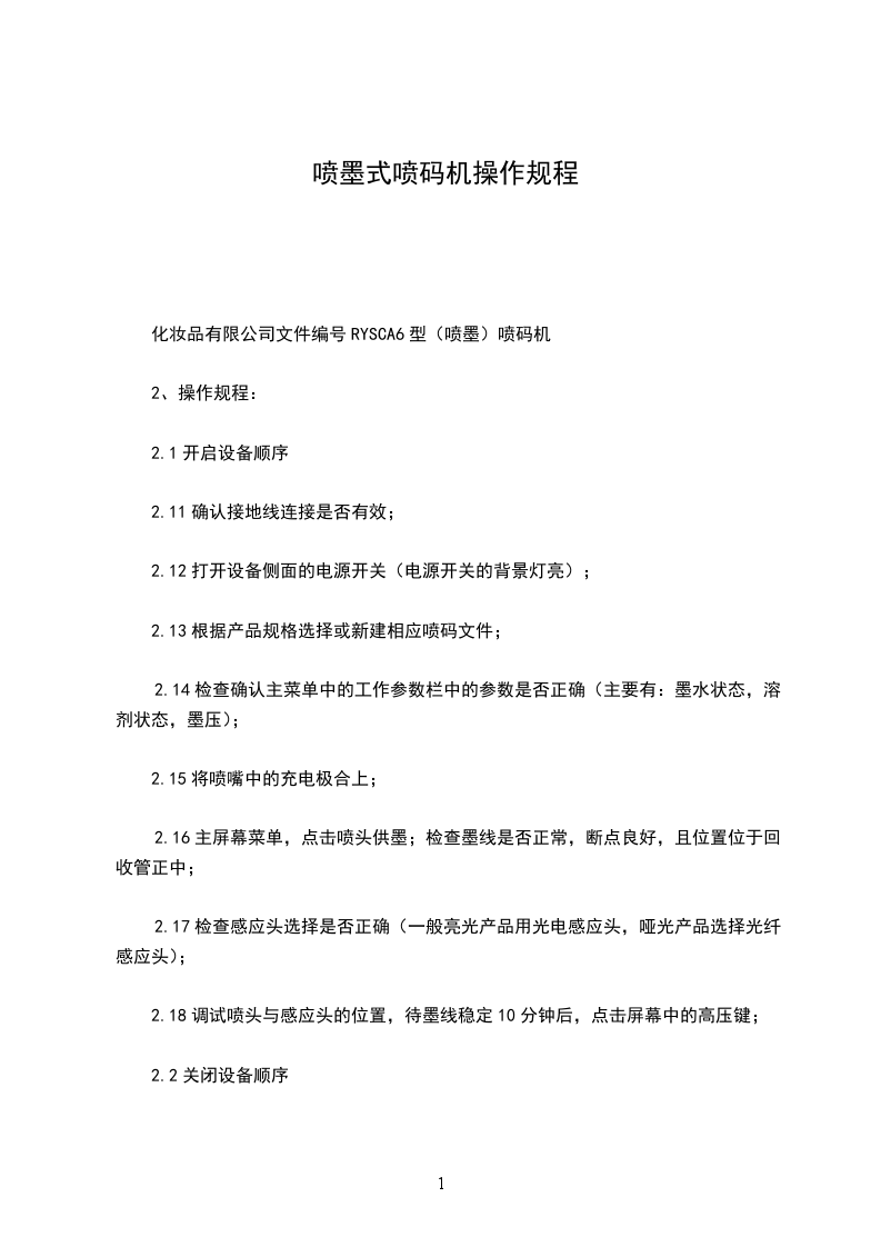 化妆品有限公司文件编号RYSCA6型(喷墨)喷码机
