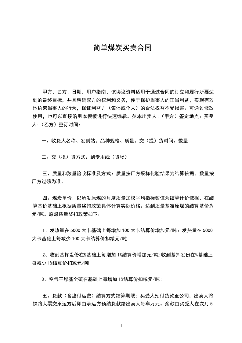 五、货款(含垫付运费)结算方式结算期限:买受人预付货款至公司,出卖人将铁路大票交承运方后即由承运方预结货款给出卖人每车万元。余款由买受人在次月5日前根据当月供货质量(加权平均指标)、发货数量计算最终结算金额后将月结算单传给出卖方核对无误,待出卖方开具相应发票后,及时将余款汇至,双方同意按两票结算,即铁路运费大票、17%煤炭增值税发票。