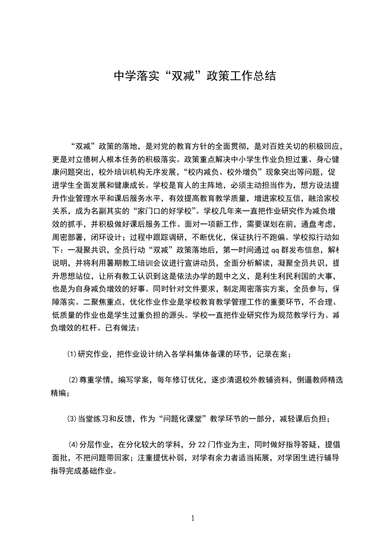 “双减”政策的落地,是对党的教育方针的全面贯彻,是对百姓关切的积极回应,更是对立德树人根本任务的积极落实。政策重点解决中小学生作业负担过重、身心健康问题突出,校外培训机构无序发展,“校内减负、校外增负”现象突出等问题,促进学生全面发展和健康成长。学校是育人的主阵地,必须主动担当作为,想方设法提升作业管理水平和课后服务水平,有效提高教育教学质量,增进家校互信,融洽家校关系,成为名副其实的“家门口的好学校”。学校几年来一直把作业研究作为减负增效的抓手,并积极做好课后服务工作。面对一项新工作,需要谋划在前,通盘考虑,周密部署,闭环设计;过程中跟踪调研,不断优化,保证执行不跑偏。学校拟行动如下:一凝聚共识,全员行动“双减”政策落地后,第一时间通过qq群发布信息,解析说明,并将利用暑期教工培训会议进行宣讲动员,全面分析解读,凝聚全员共识,提升思想站位,让所有教工认识到这是依法办学的题中之义,是利生利民利国的大事,也是为自身减负增效的好事。同时针对文件要求,制定周密落实方案,全员参与,保障落实。二聚焦重点,优化作业作业是学校教育教学管理工作的重要环节,不合理、低质量的作业也是学生过重负担的源头。学校一直把作业研究作为规范教学行为、减负增效的杠杆。已有做法: