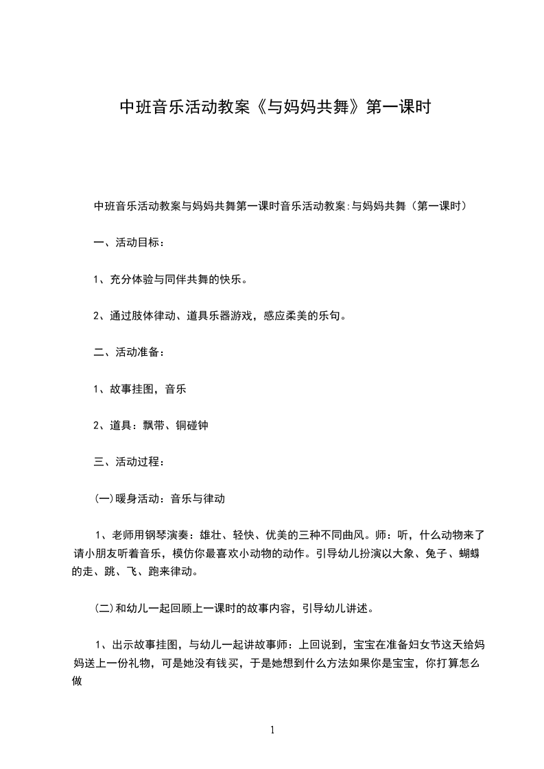 中班音乐活动教案与妈妈共舞第一课时音乐活动教案:与妈妈共舞(第一课时)