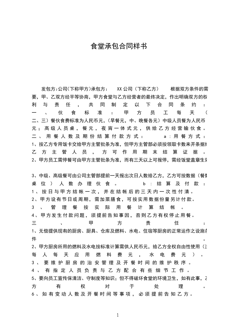 一、承包内容及经营范围承包经营甲方职工食堂,负责供应甲方职工(早、午、晚、夜宵、通宵)。在确保上述就餐正常供应后,可根据职工需要和能力许可,兼营小炒,承接接待餐业务,烟酒优质文档在您身边/双击可除饮料等零售。严禁在食堂区域内(包括宿舍)进行非法经营、活动和作其它用途。