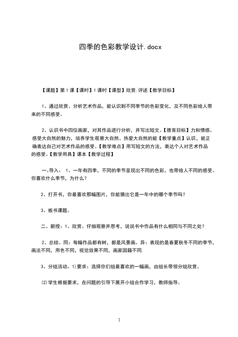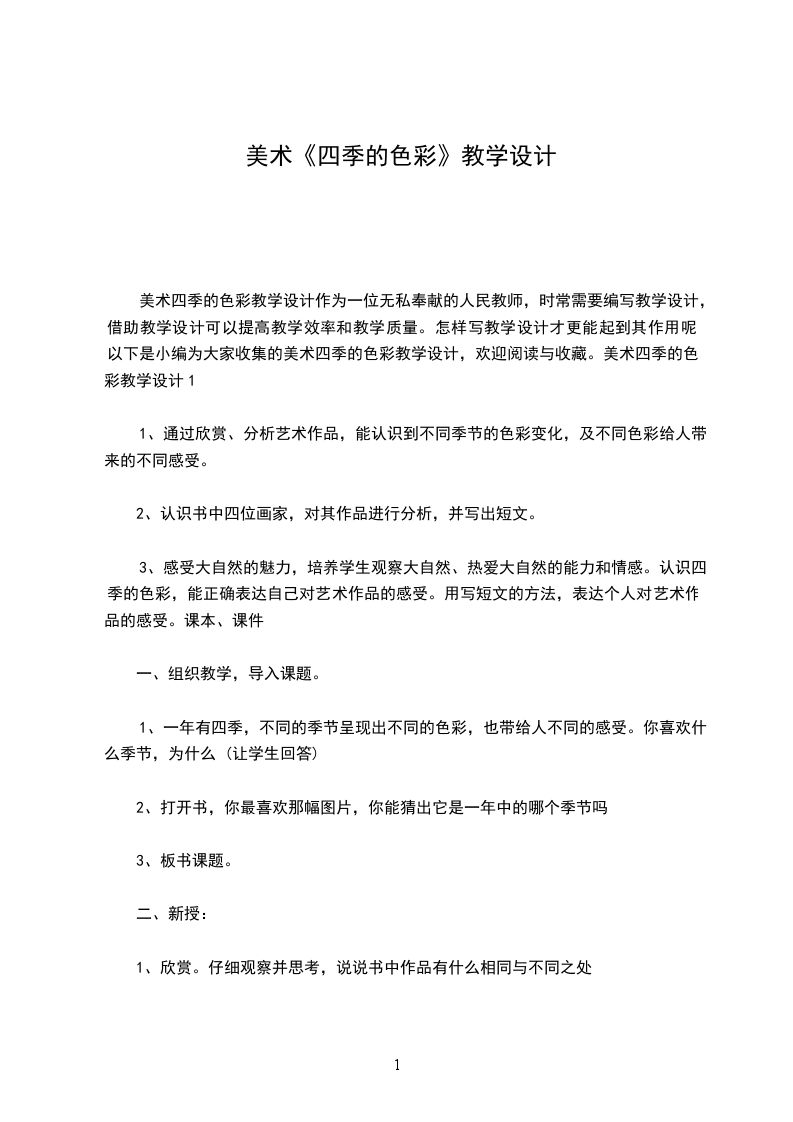 美术四季的色彩教学设计作为一位无私奉献的人民教师,时常需要编写教学设计,借助教学设计可以提高教学效率和教学质量。怎样写教学设计才更能起到其作用呢 以下是小编为大家收集的美术四季的色彩教学设计,欢迎阅读与收藏。美术四季的色彩教学设计1