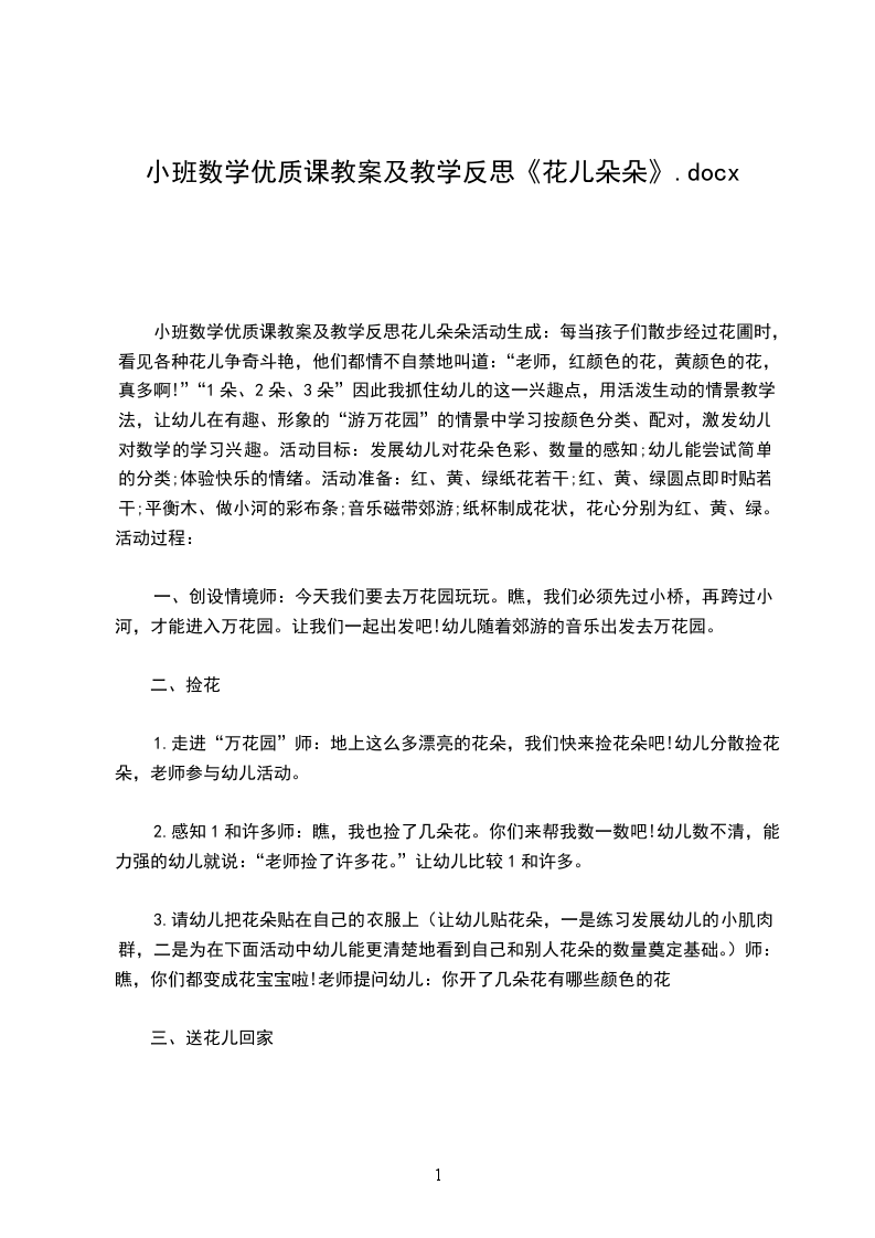 小班数学优质课教案及教学反思花儿朵朵活动生成:每当孩子们散步经过花圃时,看见各种花儿争奇斗艳,他们都情不自禁地叫道:“老师,红颜色的花,黄颜色的花,真多啊!”“1朵、2朵、3朵”因此我抓住幼儿的这一兴趣点,用活泼生动的情景教学法,让幼儿在有趣、形象的“游万花园”的情景中学习按颜色分类、配对,激发幼儿对数学的学习兴趣。活动目标:发展幼儿对花朵色彩、数量的感知;幼儿能尝试简单的分类;体验快乐的情绪。活动准备:红、黄、绿纸花若干;红、黄、绿圆点即时贴若干;平衡木、做小河的彩布条;音乐磁带郊游;纸杯制成花状,花心分别为红、黄、绿。活动过程: