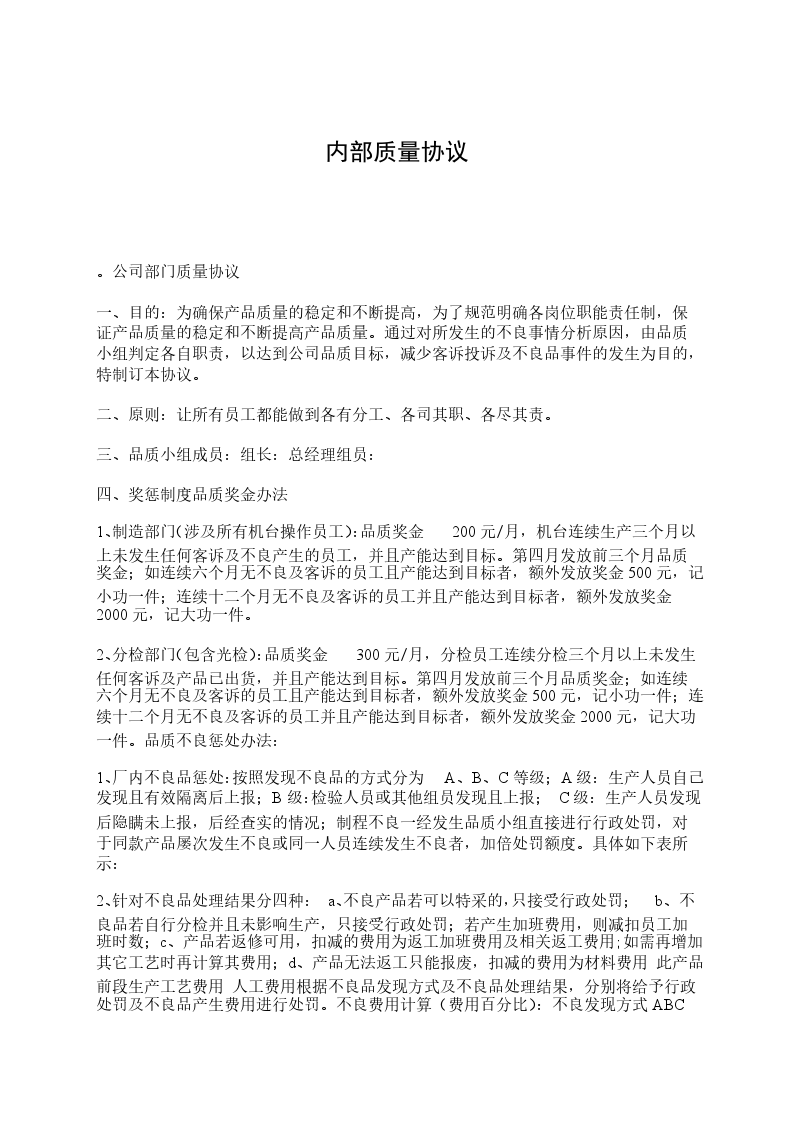 2、现场员工连续考核(A级以下)二次不合格者,记小过一次;连续考核(A级以下)三次不合格者,记大过一次。注:本公司部门质量协议由领导审批之日起即时生效。审批:日期:制造部:质量部:生管课:采购部:财务部:管理部:业务部:技术部:。4。5。致力为企业和个人提供合同协议,策划案计划书,学习课件等等打造全网一站式需求。6