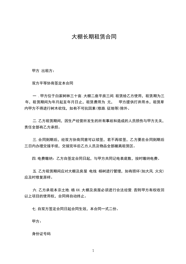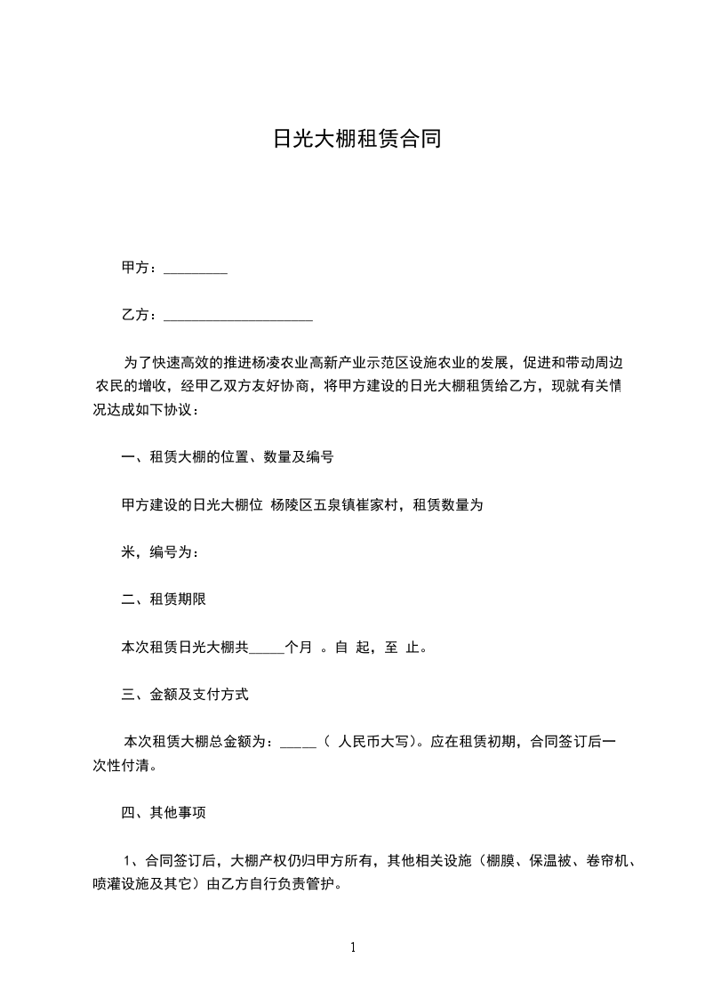 由租方(甲方):承租方(乙方):根据合同法及其他相关法律法规,遵循平等自愿公平和诚信的原则,经双方充分协商一致,甲方将其合法拥有的温室大棚租赁给乙方使用,现就有关事宜协商如下: