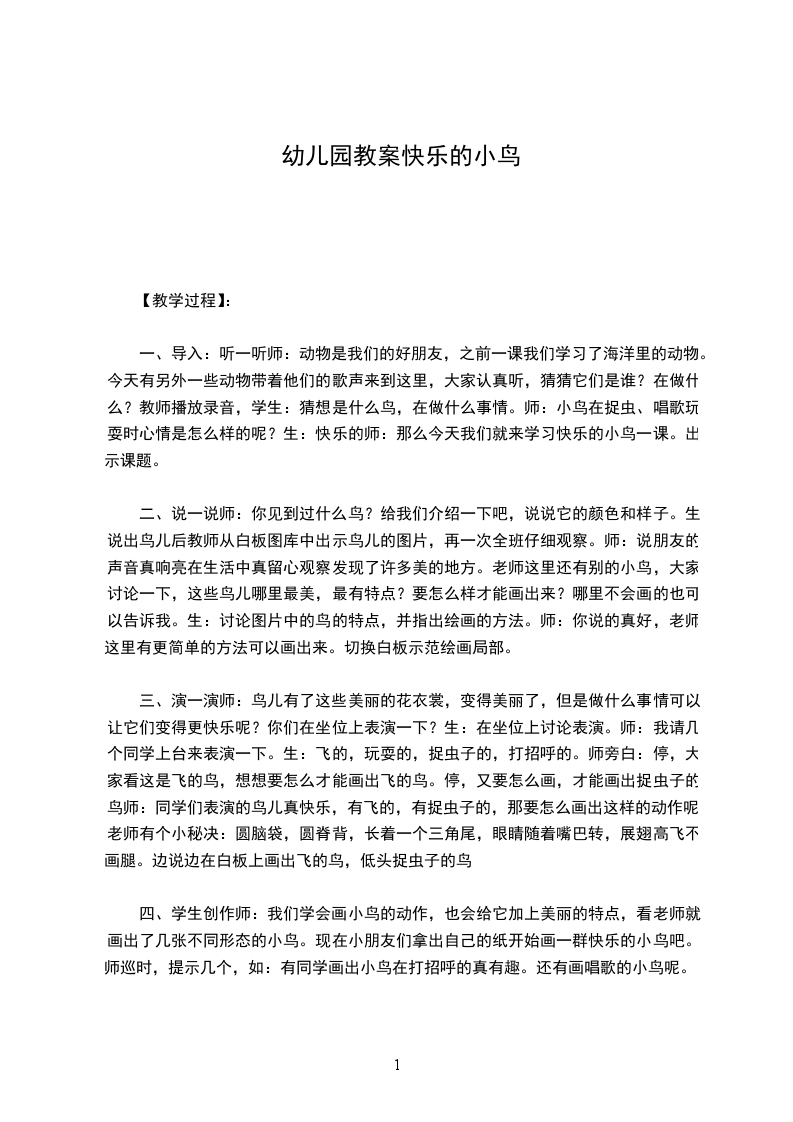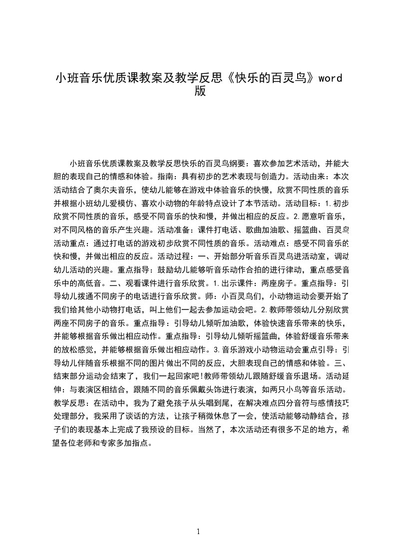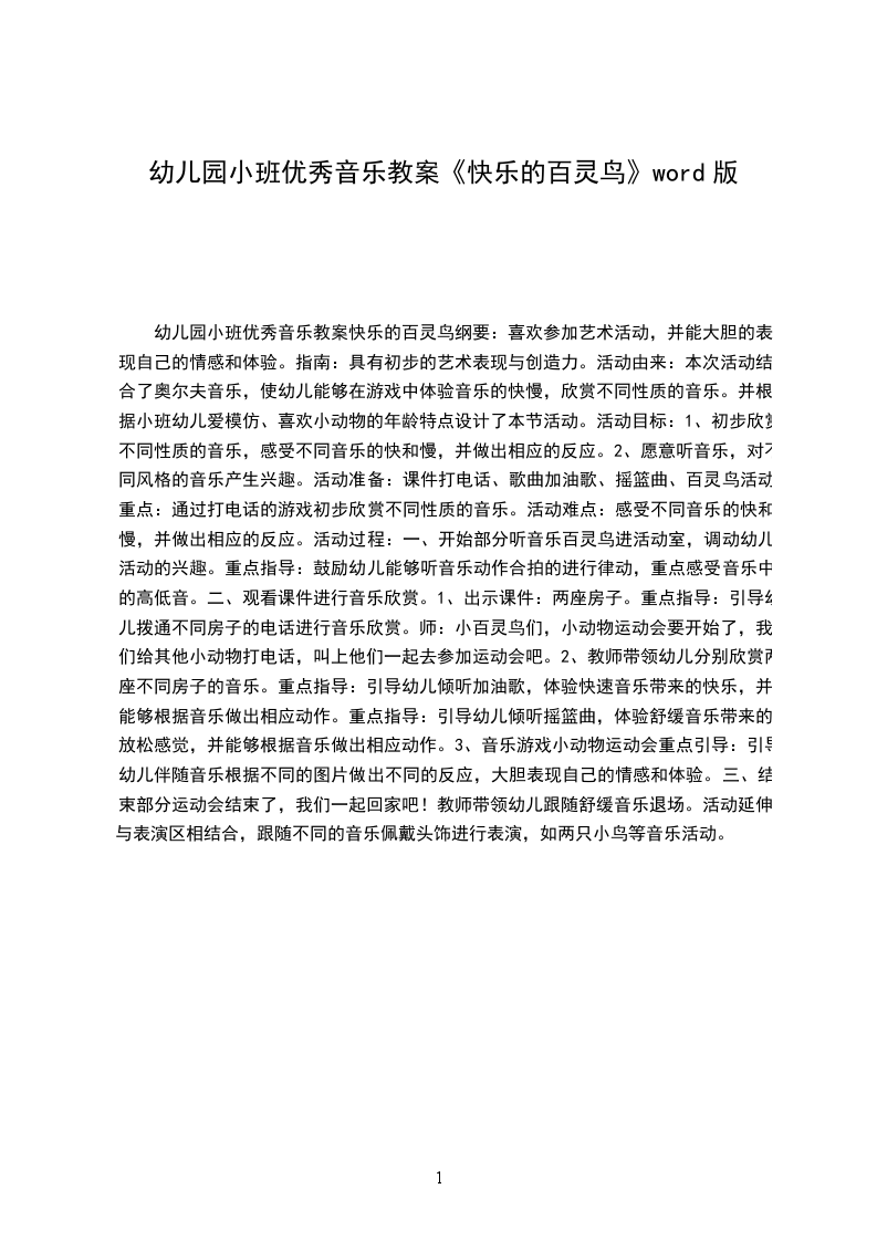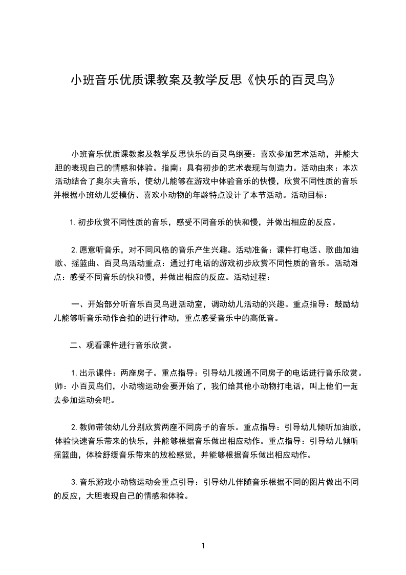 小班音乐优质课教案及教学反思快乐的百灵鸟纲要:喜欢参加艺术活动,并能大胆的表现自己的情感和体验。指南:具有初步的艺术表现与创造力。活动由来:本次活动结合了奥尔夫音乐,使幼儿能够在游戏中体验音乐的快慢,欣赏不同性质的音乐。并根据小班幼儿爱模仿、喜欢小动物的年龄特点设计了本节活动。活动目标: