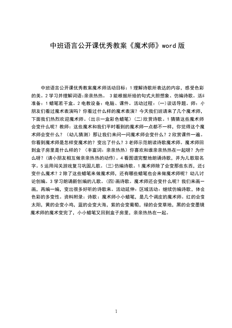 中班语言公开课优秀教案魔术师活动目标:1理解诗歌所表达的内容,感受色彩的美。2学习并理解词语:亲亲热热。3能根据所给的句式大胆想象、仿编诗歌。活动准备:1蜡笔若干盒。2电教设备:电脑、课件。活动过程: