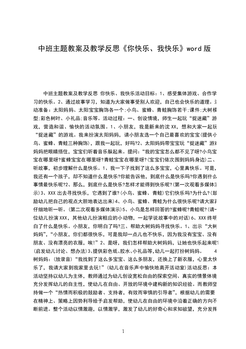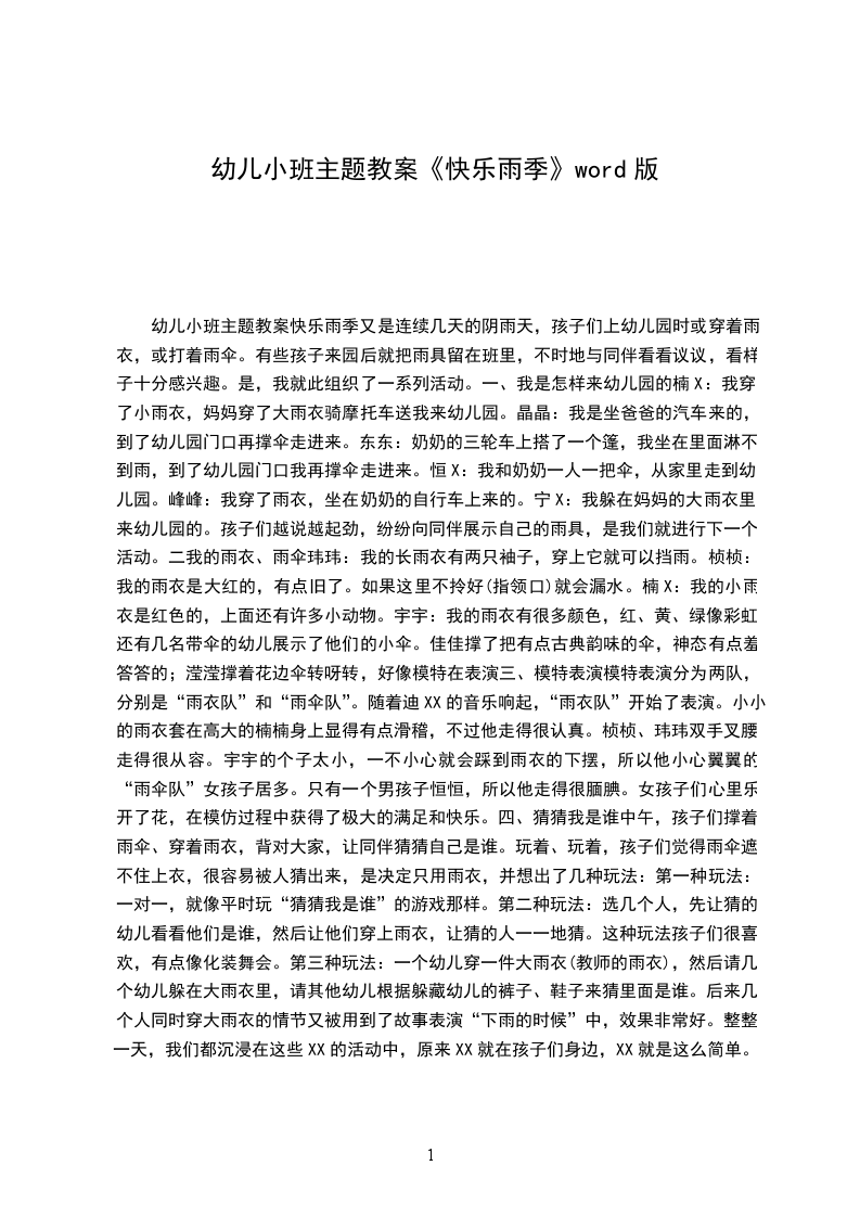 四、猜猜我是谁中午,孩子们撑着雨伞、穿着雨衣,背对大家,让同伴猜猜自己是谁。玩着、玩着,孩子们觉得雨伞遮不住上衣,很容易被人猜出来,于是决定只用雨衣,并想出了几种玩法:第一种玩法:一对一,就像平时玩“猜猜我是谁”的游戏那样。第二种玩法:选几个人,先让猜的幼儿看看他们是谁,然后让他们穿上雨衣,让猜的人一一地猜。这种玩法孩子们很喜欢,有点像化装舞会。第三种玩法:一个幼儿穿一件大雨衣(教师的雨衣),然后请几个幼儿躲在大雨衣里,请其他幼儿根据躲藏幼儿的裤子、鞋子来猜里面是谁。后来几个人同时穿大雨衣的情节又被用到了故事表演“下雨的时候”中,效果非常好。整整一天,我们都沉浸在这些快乐的活动中,原来快乐就在孩子们身边,快乐就是这么简单。