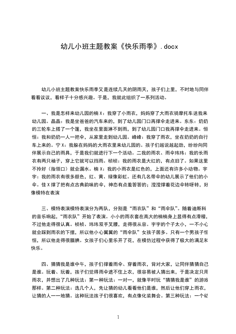 一、我是怎样来幼儿园的楠X:我穿了小雨衣,妈妈穿了大雨衣骑摩托车送我来幼儿园。晶晶:我是坐爸爸的汽车来的,到了幼儿园门口再撑伞走进来。东东:奶奶的三轮车上搭了一个篷,我坐在里面淋不到雨,到了幼儿园门口我再撑伞走进来。恒恒:我和奶奶一人一把伞,从家里走到幼儿园。峰峰:我穿了雨衣,坐在奶奶的自行车上来的。宁X:我躲在妈妈的大雨衣里来幼儿园的。孩子们越说越起劲,纷纷向同伴展示自己的雨具,于是我们就进行下一个活动。二我的雨衣、雨伞玮玮:我的长雨衣有两只袖子,穿上它就可以挡雨。桢桢:我的雨衣是大红的,有点旧了。如果这里不拎好(指领口)就会漏水。楠X:我的小雨衣是红色的,上面还有许多小动物。宇宇:我的雨衣有很多颜色,红、黄、绿像彩虹。还有几名带伞的幼儿展示了他们的小伞。佳X撑了把有点古典韵味的伞,神态有点羞答答的;滢滢撑着花边伞转呀转,好像模特在表演