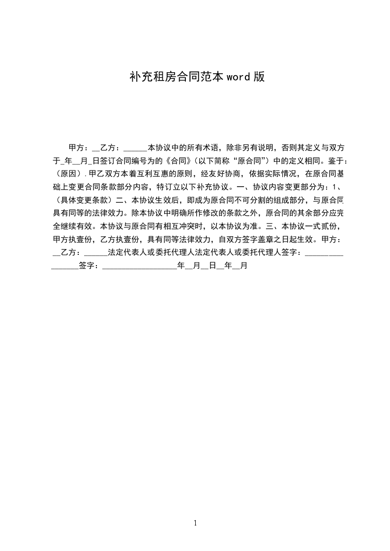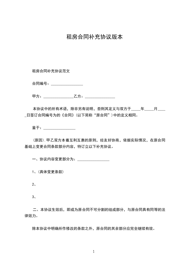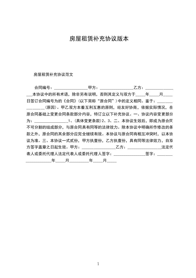 十、本补充协议经双方协商一致,愿同遵守执行。甲乙双方各一份,具有同等效力,涂改无效。本协议在双方续租房屋时同样生效。