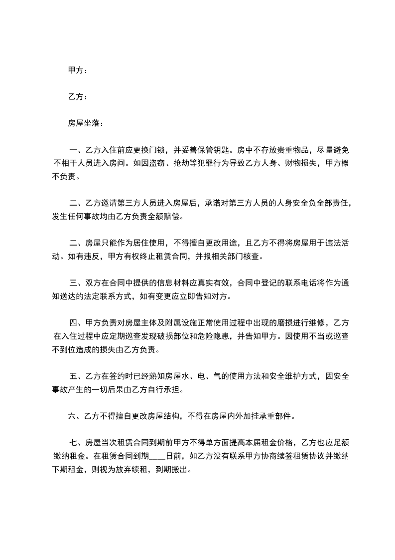 一、乙方入住前应更换门锁,并妥善保管钥匙。房中不存放贵重物品,尽量避免不相干人员进入房间。如因盗窃、抢劫等犯罪行为导致乙方人身、财物损失,甲方概不负责。