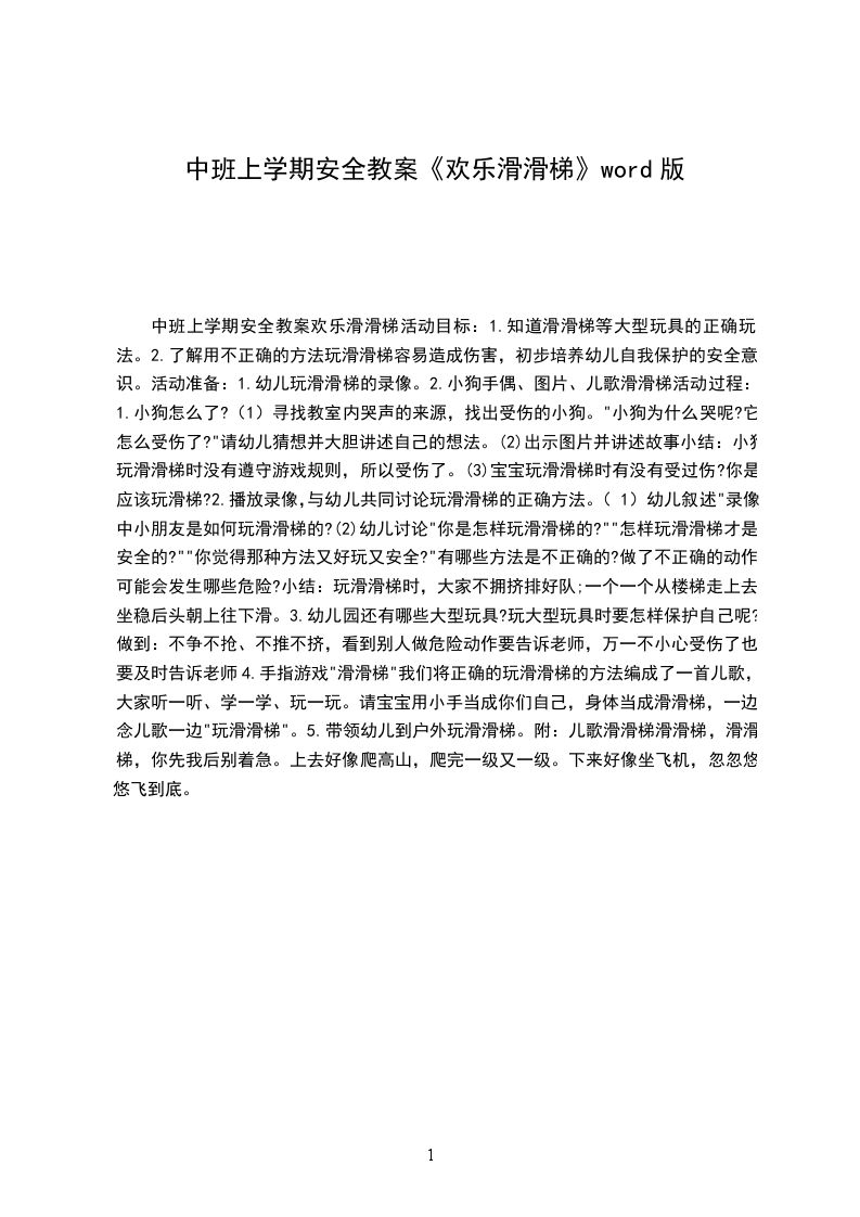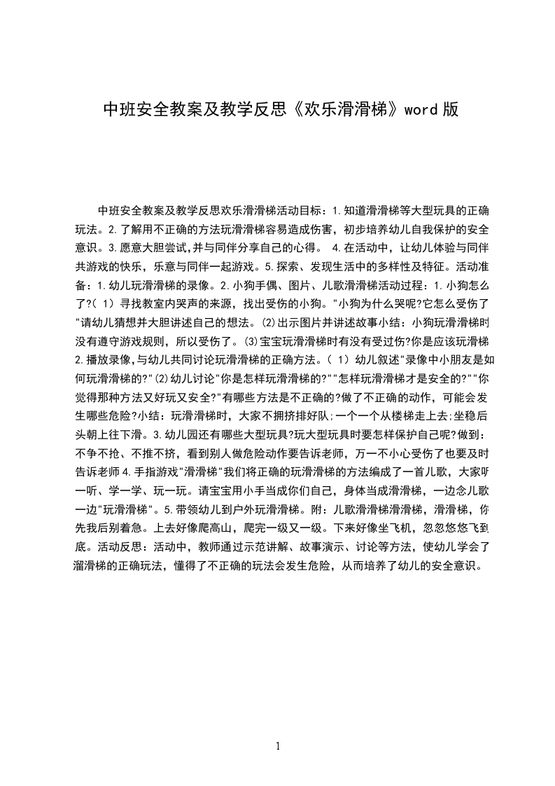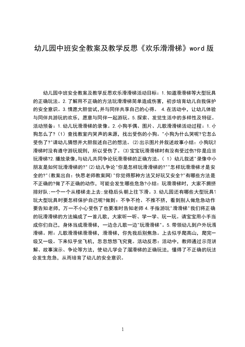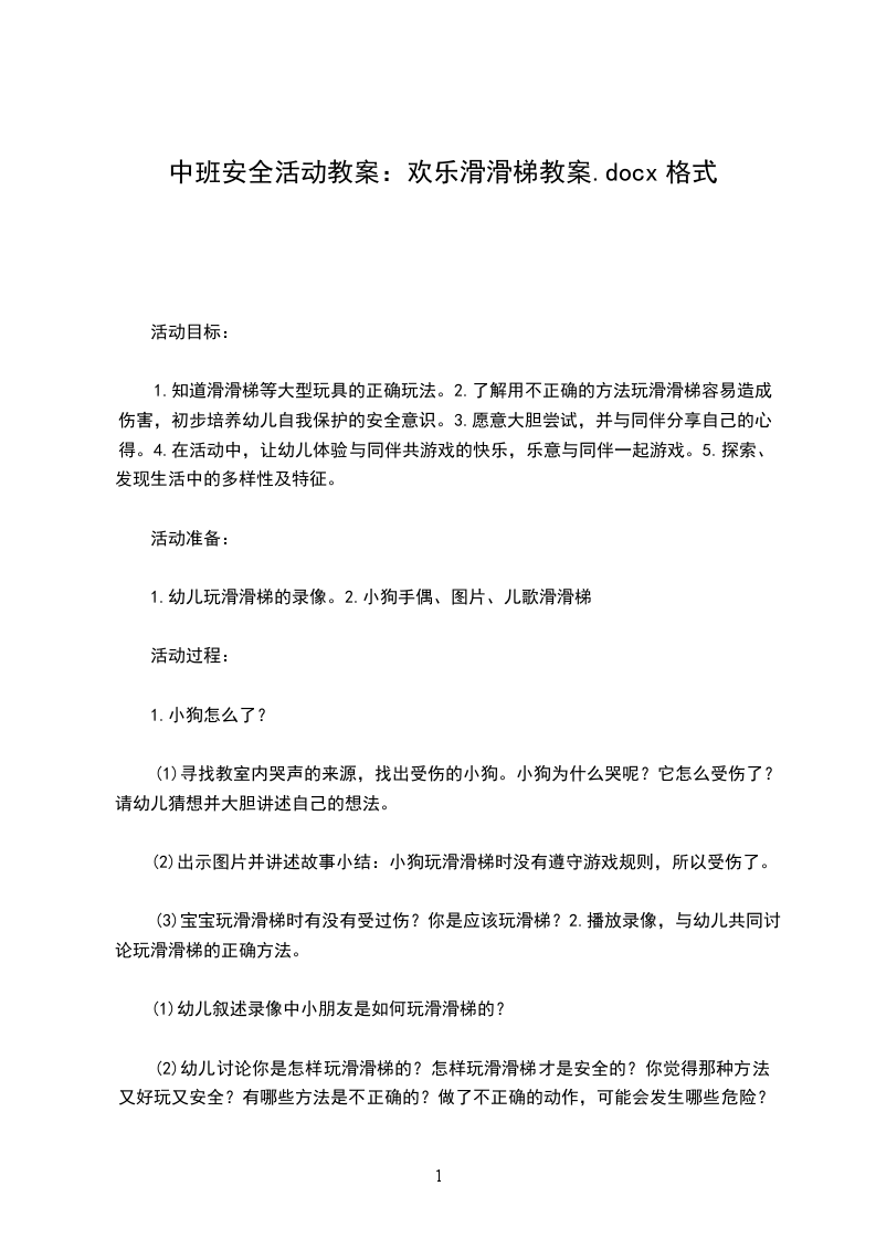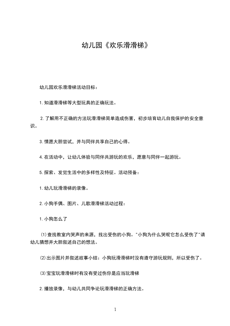 5.带领幼儿到户外玩滑滑梯。附:儿歌滑滑梯滑滑梯,滑滑梯,你先我后别焦急。上去似乎爬高山,爬完一级又一级。下来似乎坐飞机,忽忽悠悠飞究竟。活动反思:活动中,教师通过示范讲解、故事演示、争论等方法,使幼儿学会了溜滑梯的正确玩法,懂得了不正确的玩法会发生危急,从而培育了幼儿的安全意识。