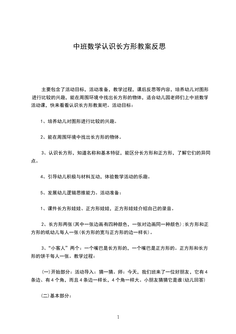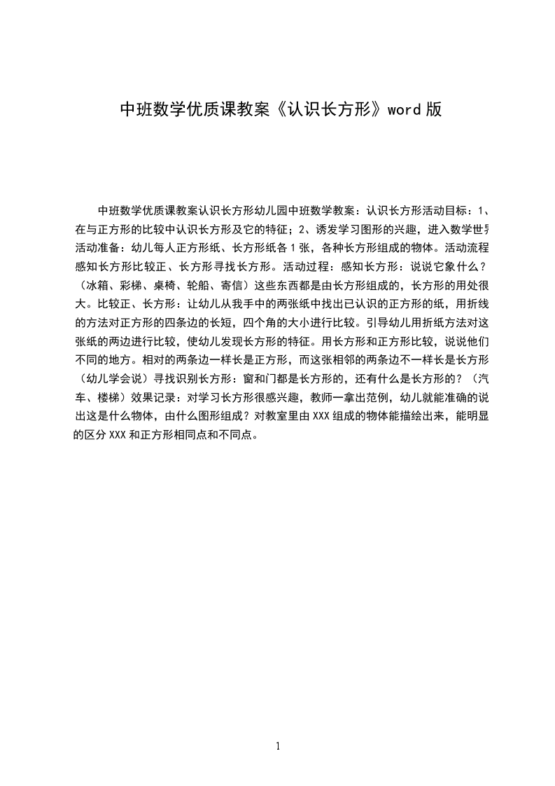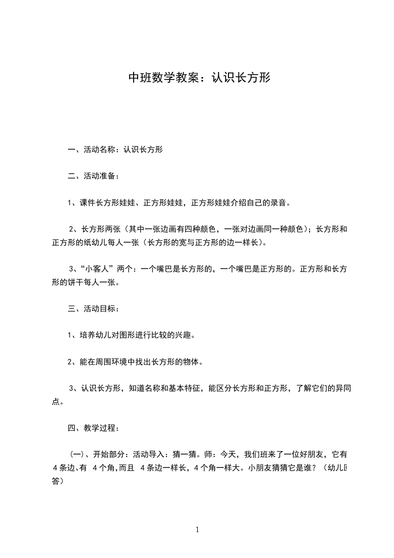 3、出示长方形娃娃,引导幼儿认识长方形。师小结:长方形有4个角,4个角一样大,有4条边,对边一样长。
