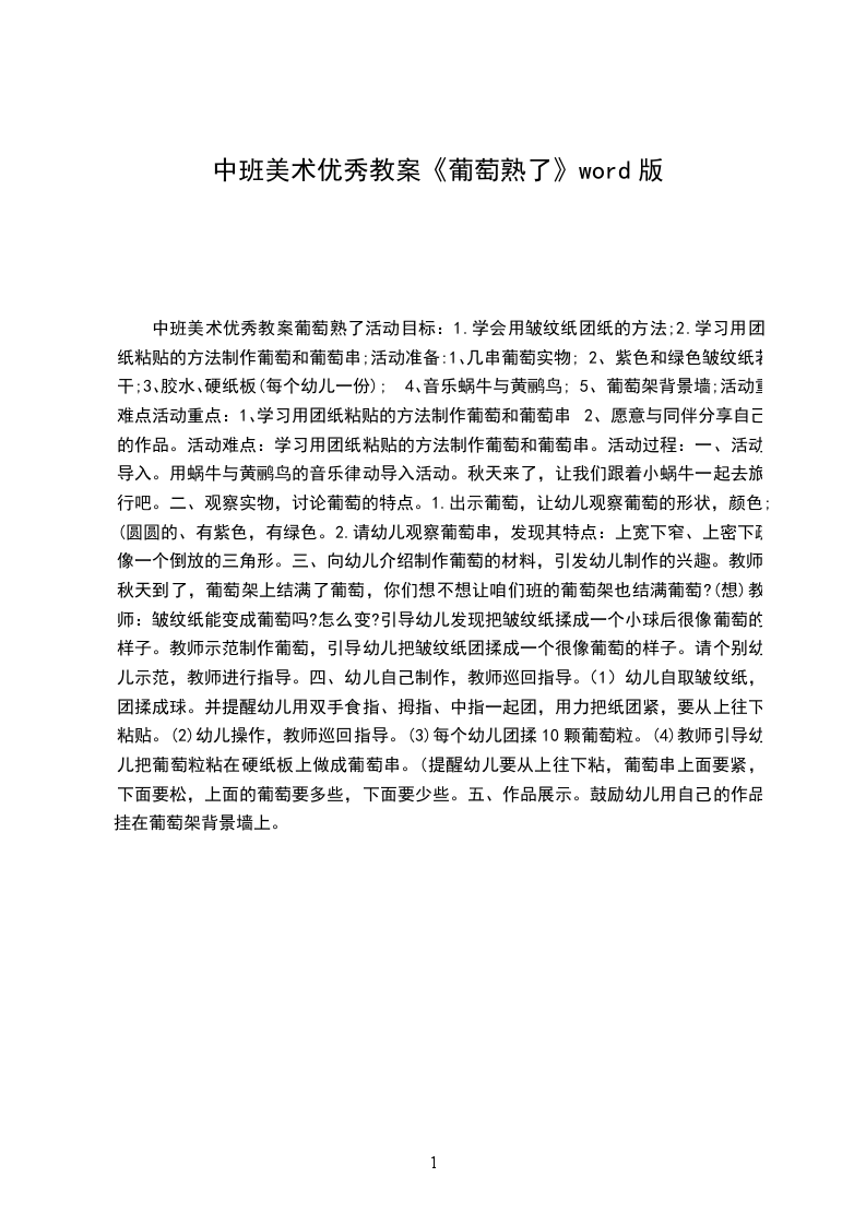 5、展示幼儿作品,引导幼儿相互评价。教师:你是怎么用叠印的方法表现水灵灵的葡萄的你在面一串葡萄的时候遇到了什么问题活动评析:由于幼儿空间概念的限制,对于一串葡萄的表现会有一定闲难,有的葡萄会越砌越小如果遇到这样的问题,教师不要着急,可以用情景化的语言指导,例如"大大的葡萄才好吃哦!"。教学反思:在美术活动中,激发幼儿联想、创造,从不同角度、不同途径探索问题的不同答案。活动中多多给予肯定、鼓励和赞赏。幼儿通过本次的活动,生活和自理能力都有了很大的发展,对周围的事物都有了较好的认识。