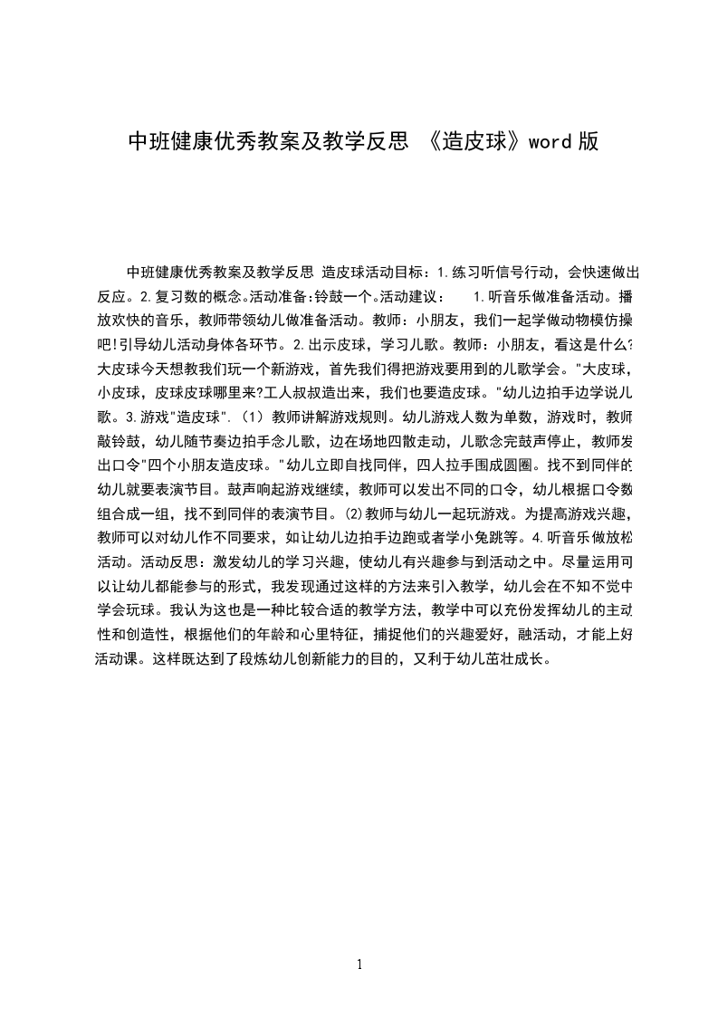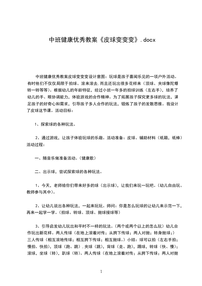 中班健康优秀教案皮球变变变设计意图:玩球是孩子喜闻乐见的一项户外活动。有时他们不仅仅局限于拍球、滚来滚去,而且还玩出很多花样来(顶球、夹球像陀螺转一转等等)。根据幼儿的年龄特征,经过小班一年多的拍球训练(左右手),培养了幼儿的手、眼协调能力,体验游戏的合作精神。为了拓展孩子探究更多球的玩法,满足孩子的好奇心和需求,引导孩子多人合作的玩法,锻炼了孩子的发散思维。我设计了皮球这节课。活动目标: