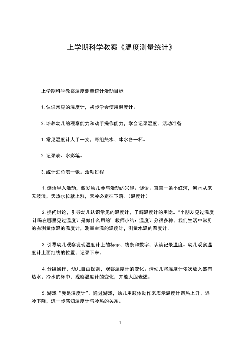 2.提问讨论,引导幼儿认识常见的温度计,了解温度计的用途。“小朋友见过温度计吗在哪里见过温度计是做什么用的”教师小结:温度计分很多种,我们生活中常见的有测量体温的温度计,测量室温的温度计,测量水温的温度计。
