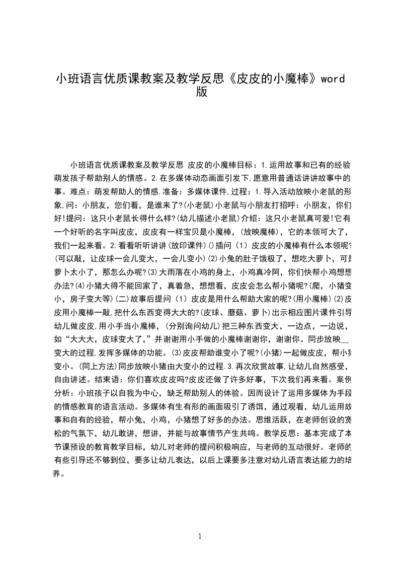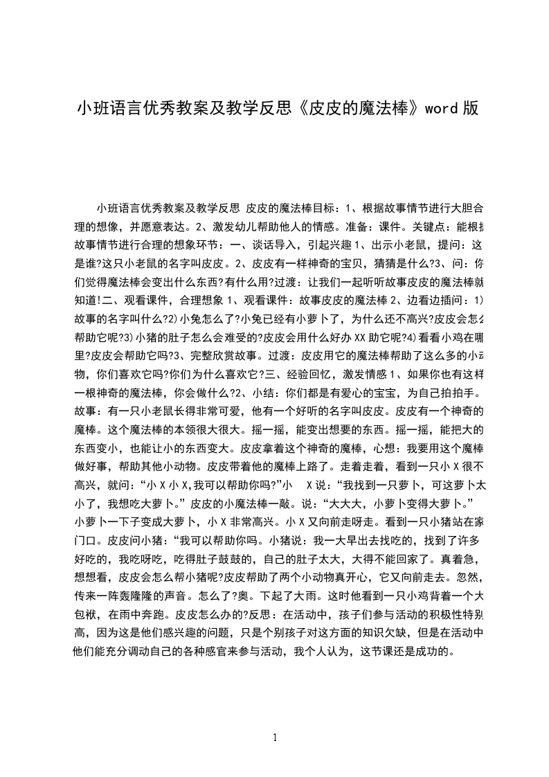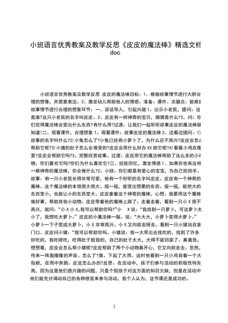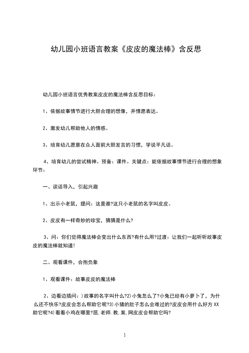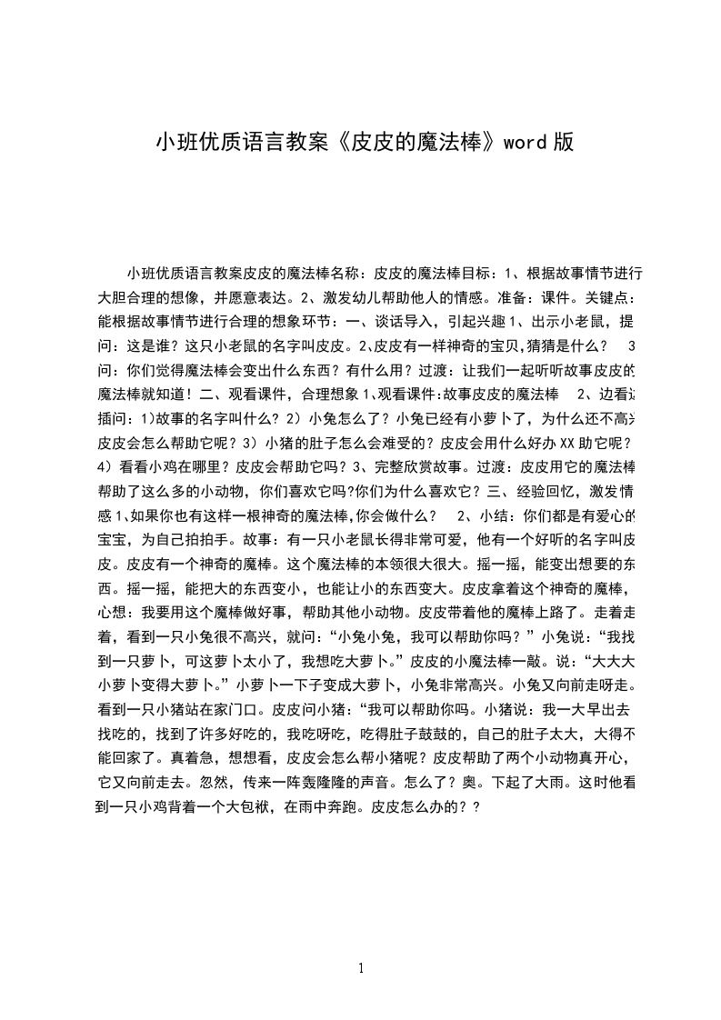 小班主题教案:皮皮的小魔棒小班主题教案:皮皮的小魔棒目标:1运用故事和已有的经验萌发孩子帮助别人的情感。2在多媒体动态画面引发下,愿意用普通话讲讲故事中的事。难点:萌发帮助人的情感。准备:多媒体课件,过程: