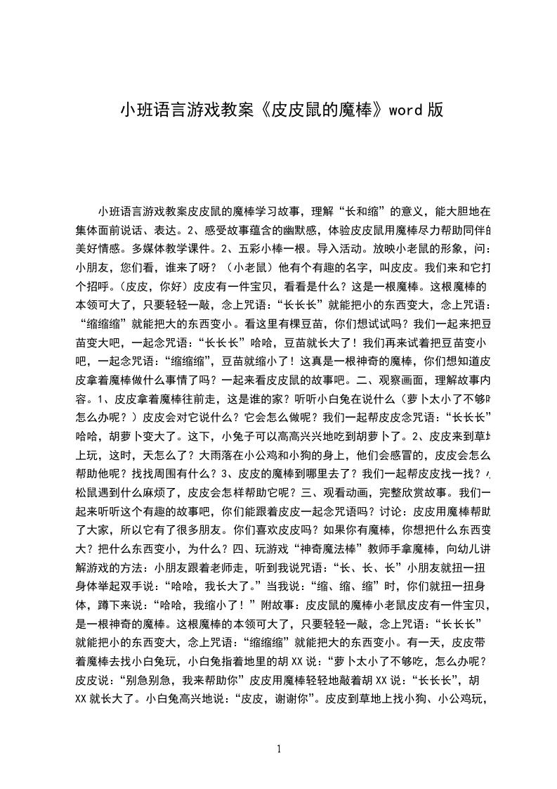 1.导入活动放映小老鼠的形象,问:小朋友,您们看,是谁来了(小老鼠)小老鼠与小朋友打招呼:小朋友,你们好!提问:这只小老鼠长得什么样(幼儿描述小老鼠)介绍:这只小老鼠真可爱!它有一个好听的名字叫皮皮,皮皮有一样宝贝是小魔棒,(放映魔棒),它的本领可大了,我们一起来看。