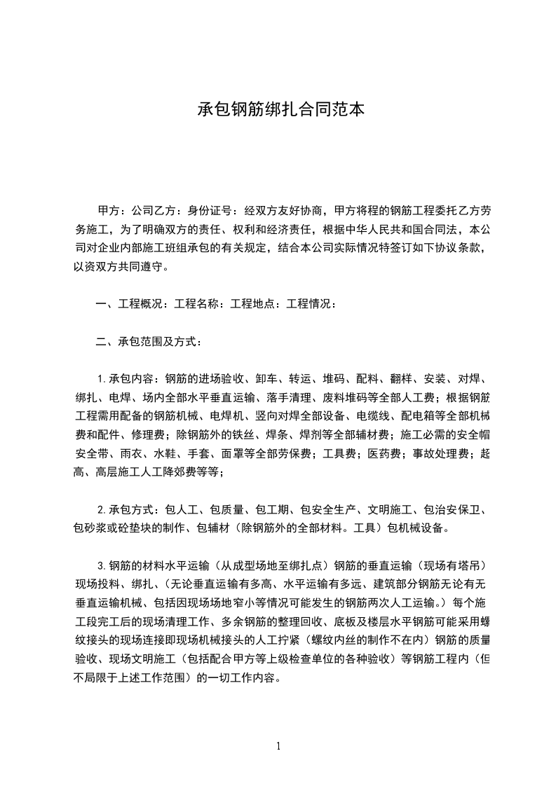 甲方:公司乙方:身份证号:经双方友好协商,甲方将程的钢筋工程委托乙方劳务施工,为了明确双方的责任、权利和经济责任,根据中华人民共和国合同法,本公司对企业内部施工班组承包的有关规定,结合本公司实际情况特签订如下协议条款,以资双方共同遵守。