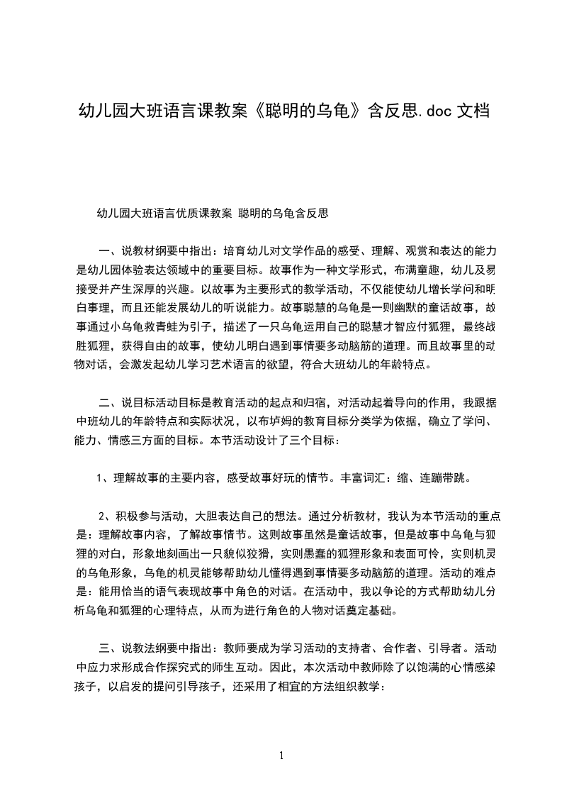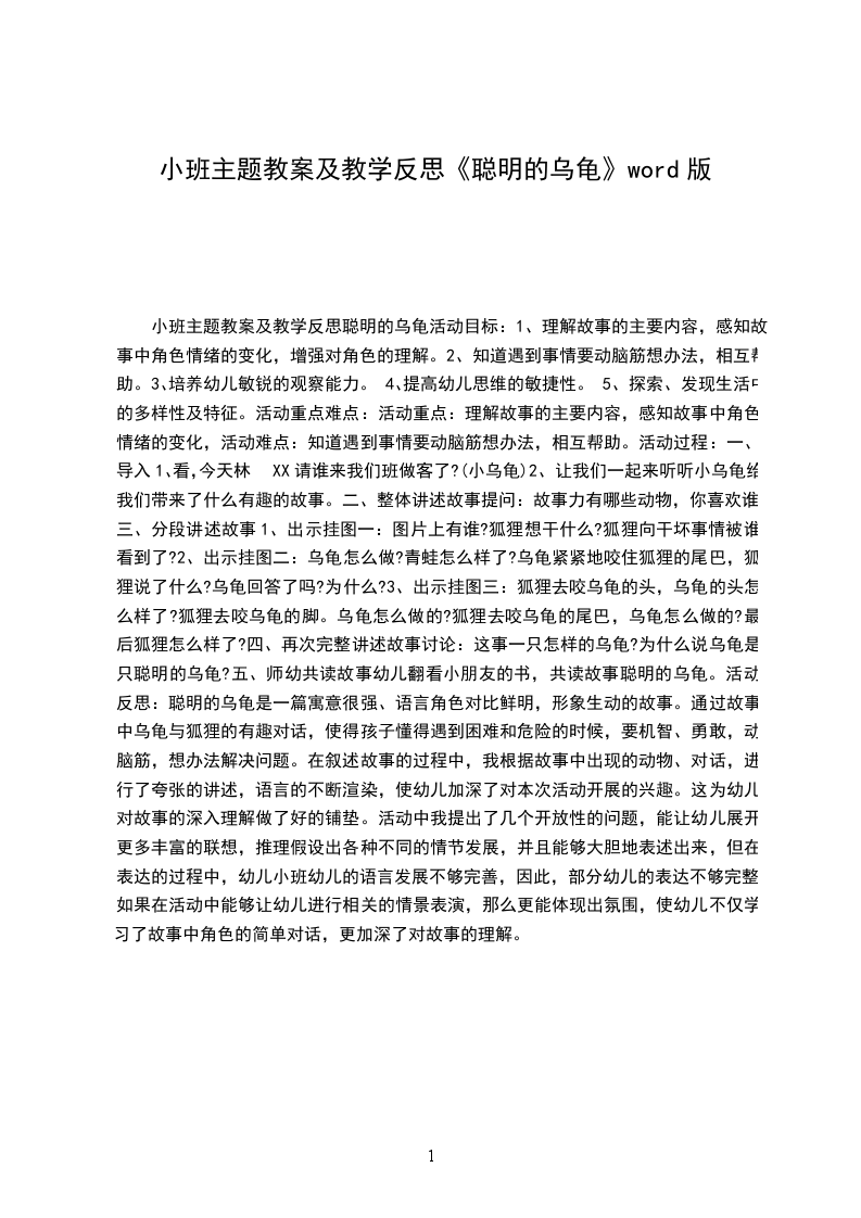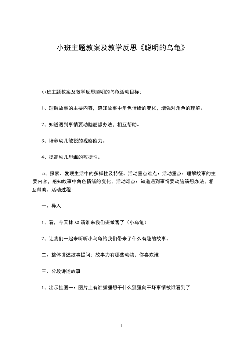 五、师幼共读故事幼儿翻看小朋友的书,共读故事聪明的乌龟。活动反思:聪明的乌龟是一篇寓意很强、语言角色对比鲜明,形象生动的故事。通过故事中乌龟与狐狸的有趣对话,使得孩子懂得遇到困难和危险的时候,要机智、勇敢,动脑筋,想办法解决问题。在叙述故事的过程中,我根据故事中出现的动物、对话,进行了夸张的讲述,语言的不断渲染,使幼儿加深了对本次活动开展的兴趣。这为幼儿对故事的深入理解做了好的铺垫。活动中我提出了几个开放性的问题,能让幼儿展开更多丰富的联想,推理假设出各种不同的情节发展,并且能够大胆地表述出来,但在表达的过程中,幼儿小班幼儿的语言发展不够完善,因此,部分幼儿的表达不够完整。如果在活动中能够让幼儿进行相关的情景表演,那么更能体现出氛围,使幼儿不仅学习了故事中角色的简单对话,更加深了对故事的理解。
