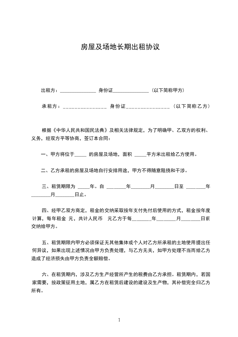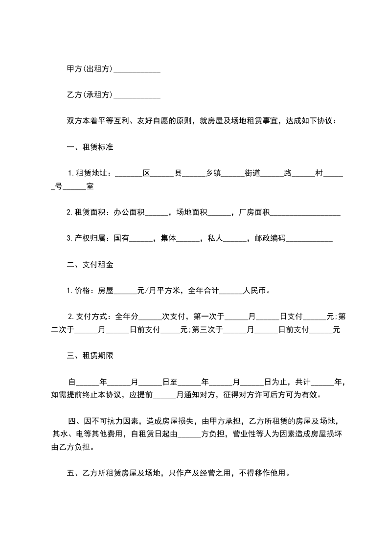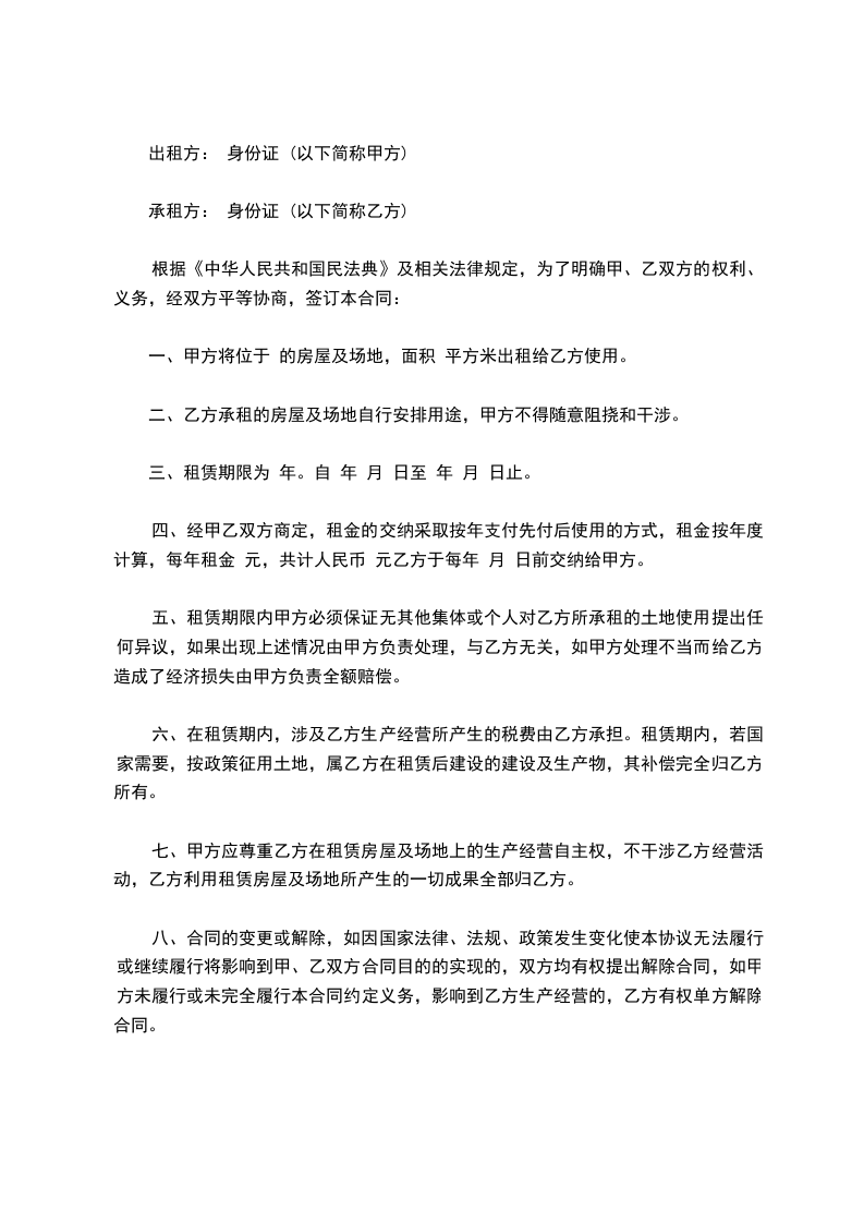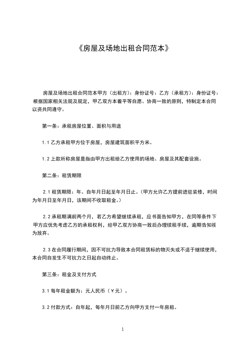 房屋及场地出租合同范本甲方(出租方):身份证号:乙方(承租方):身份证号:根据国家相关法规及规定,甲乙双方本着平等自愿、协商一致的原则,特制定本合同,以资共同遵守。