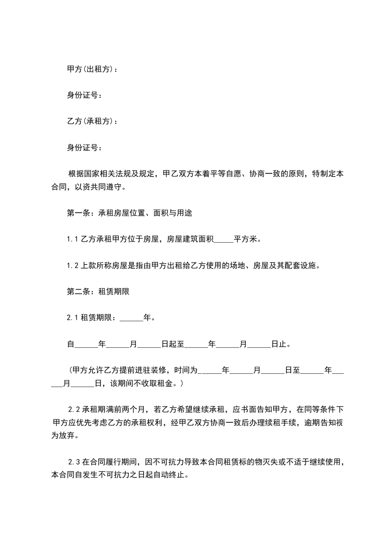 2.1租赁期限:年。自年月日起至年月日止。(甲方允许乙方提前进驻装修,时间为年月日至年月日,该期间不收取租金。)