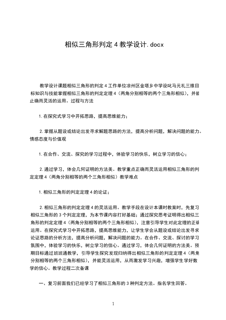 教学设计课题相似三角形的判定4工作单位凉州区金塔乡中学设叱马元礼三维目标知识与技能掌握相似三角形的判定定理4(两角分别相等的两个三角形相似),并能止确而灵活的运用。过程与方法