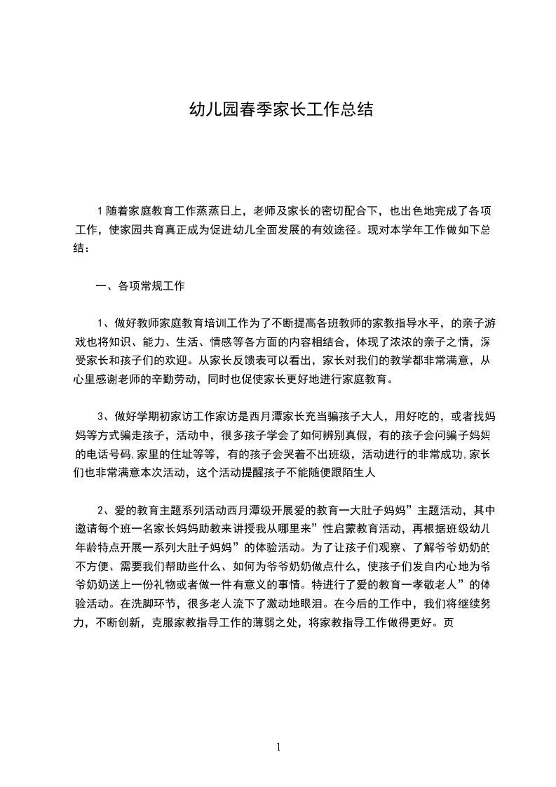 1随着家庭教育工作蒸蒸日上,老师及家长的密切配合下,也出色地完成了各项工作,使家园共育真正成为促进幼儿全面发展的有效途径。现对本学年工作做如下总结: