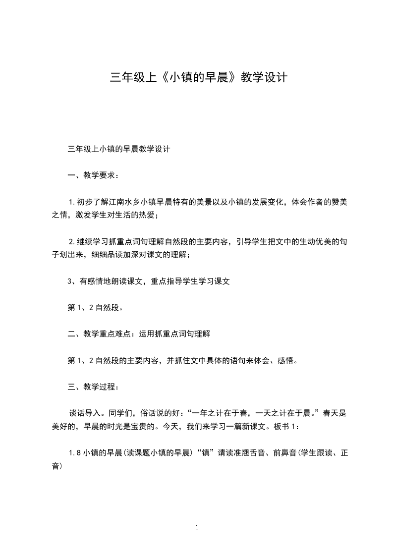 三年级上小镇的早晨教学设计