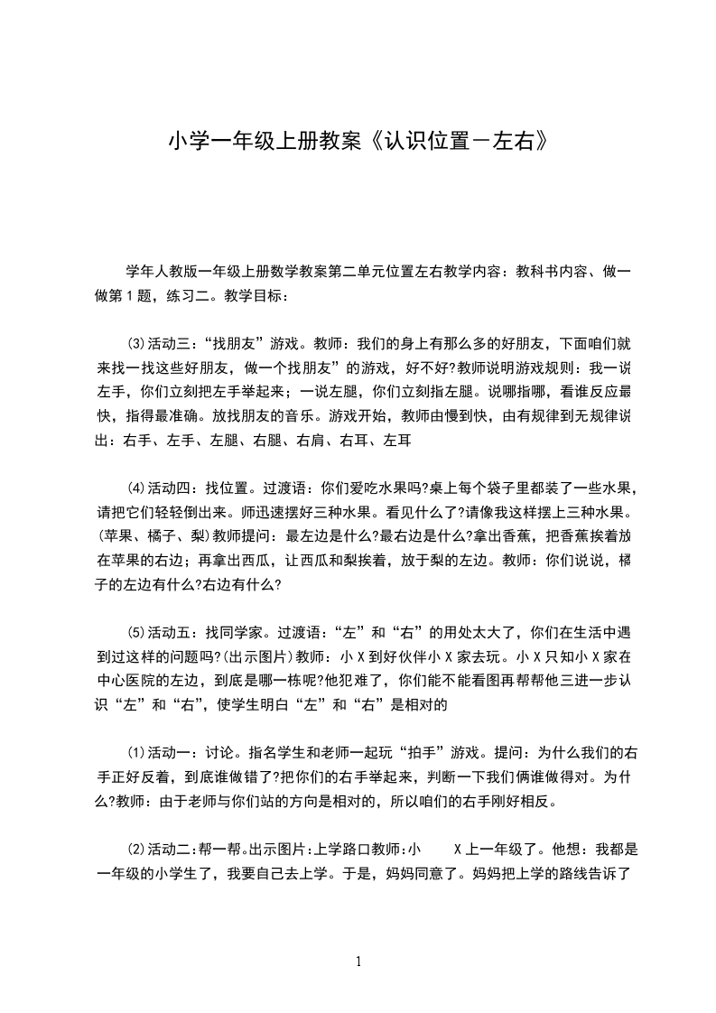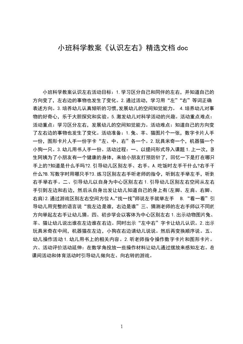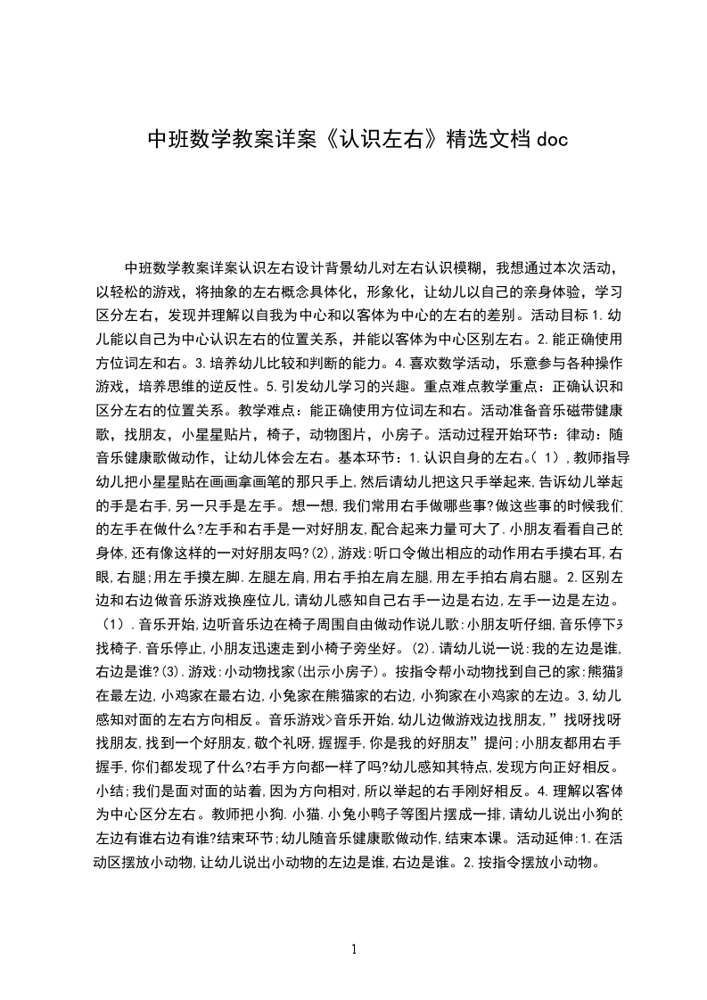 5.引发幼儿学习的兴趣。重点难点教学重点:正确认识和区分左右的位置关系。教学难点:能正确使用方位词左和右。活动准备音乐磁带健康歌,找朋友,小星星贴片,椅子,动物图片,小房子。活动过程开始环节:律动:随音乐健康歌做动作,让幼儿体会左右。基本环节:
