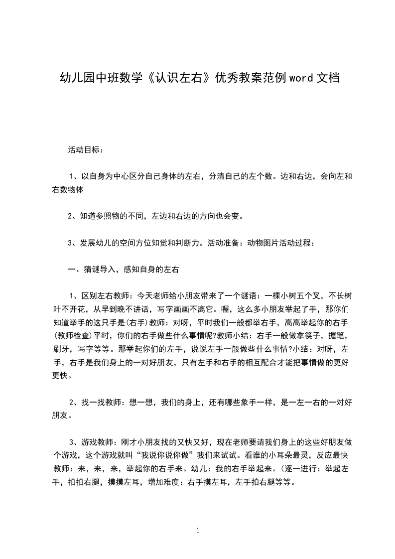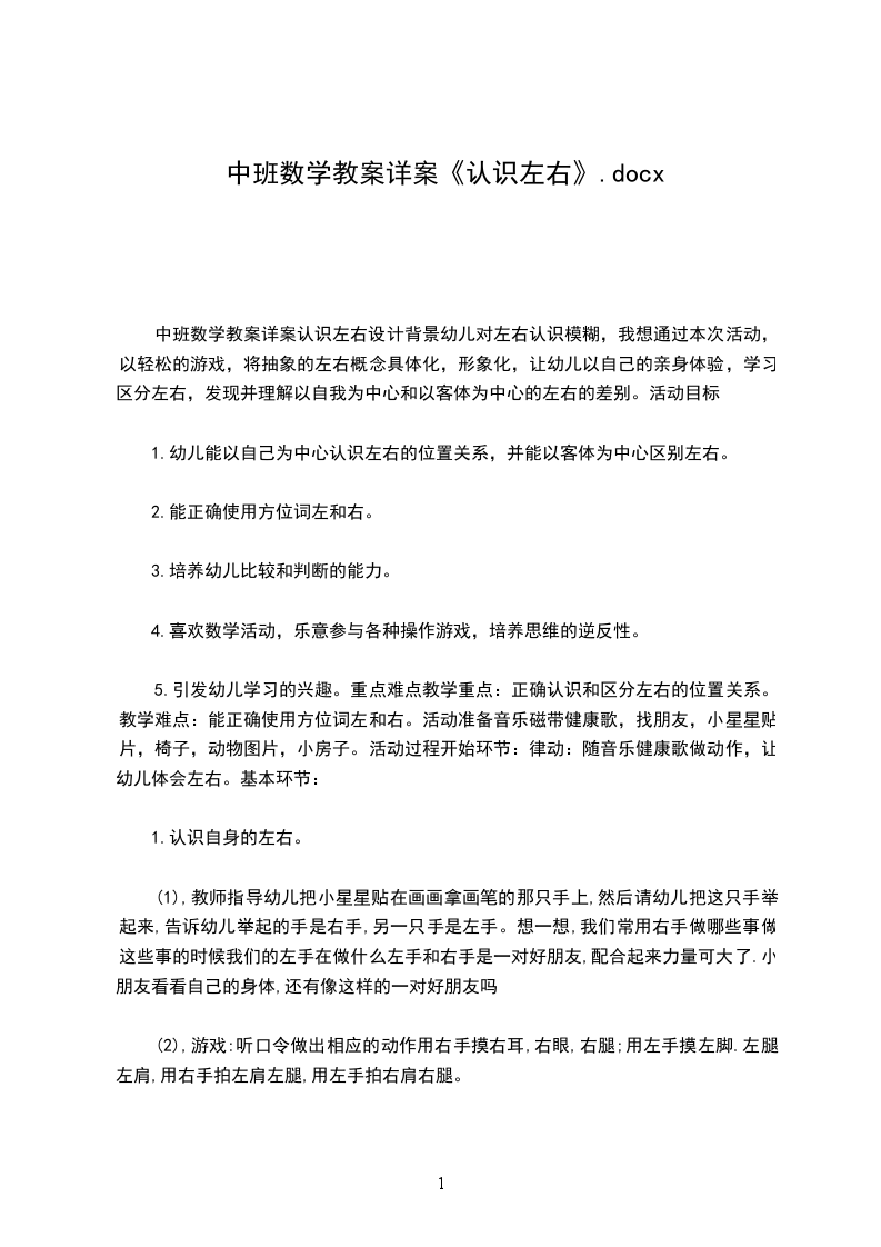 中班数学教案详案认识左右设计背景幼儿对左右认识模糊,我想通过本次活动,以轻松的游戏,将抽象的左右概念具体化,形象化,让幼儿以自己的亲身体验,学习区分左右,发现并理解以自我为中心和以客体为中心的左右的差别。活动目标