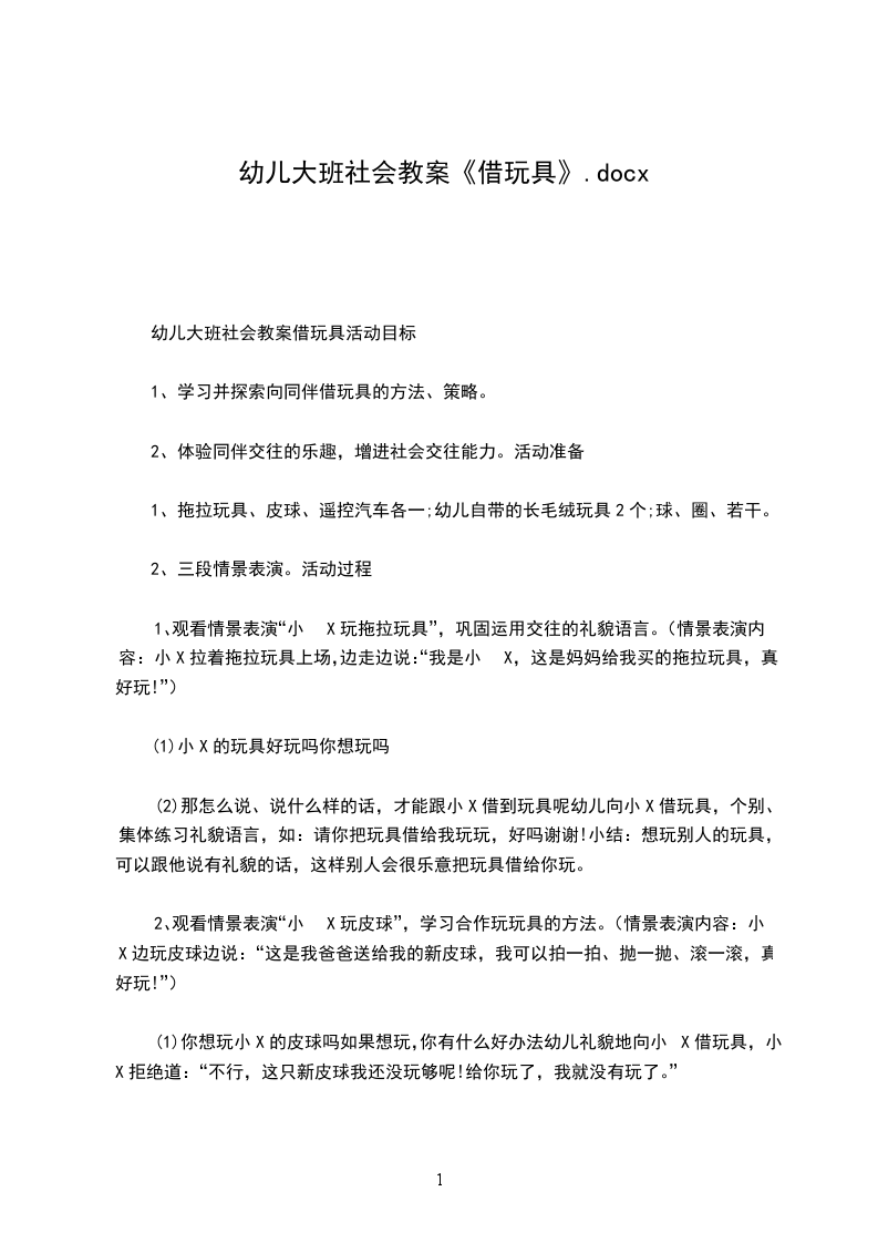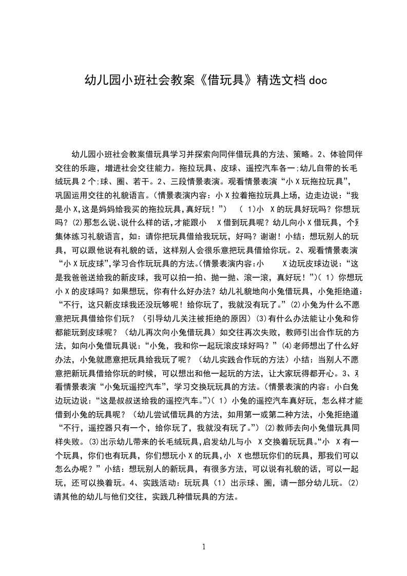 (2)那怎么说、说什么样的话,才能跟小X借到玩具呢幼儿向小X借玩具,个别、集体练习礼貌语言,如:请你把玩具借给我玩玩,好吗谢谢!小结:想玩别人的玩具,可以跟他说有礼貌的话,这样别人会很乐意把玩具借给你玩。