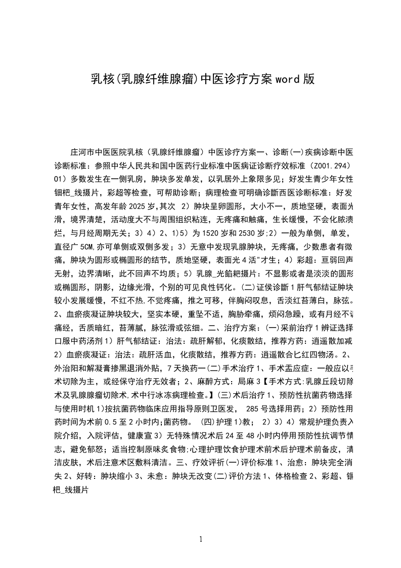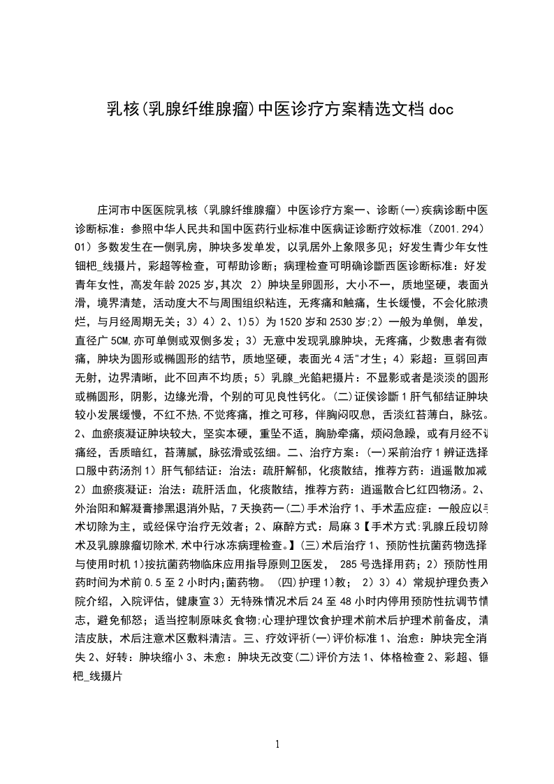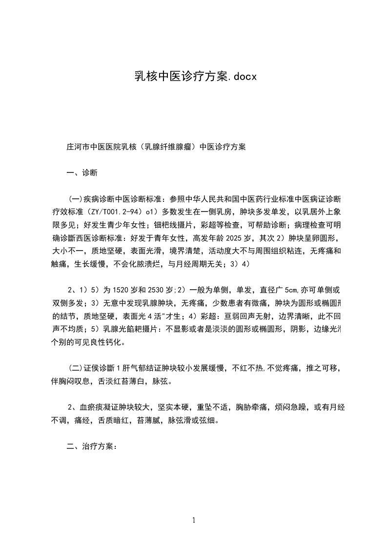 (一)疾病诊断中医诊断标准:参照中华人民共和国中医药行业标准中医病证诊断疗效标准(ZY/T001.2-94)o1)多数发生在一侧乳房,肿块多发单发,以乳居外上象限多见;好发生青少年女性;钿杷线摄片,彩超等检查,可帮助诊断;病理检查可明确诊斷西医诊断标准:好发于青年女性,高发年龄2025岁,其次2)肿块呈卵圆形,大小不一,质地坚硬,表面光滑,境界清楚,活动度大不与周围组织粘连,无疼痛和触痛,生长缓慢,不会化脓溃烂,与月经周期无关;3)4)