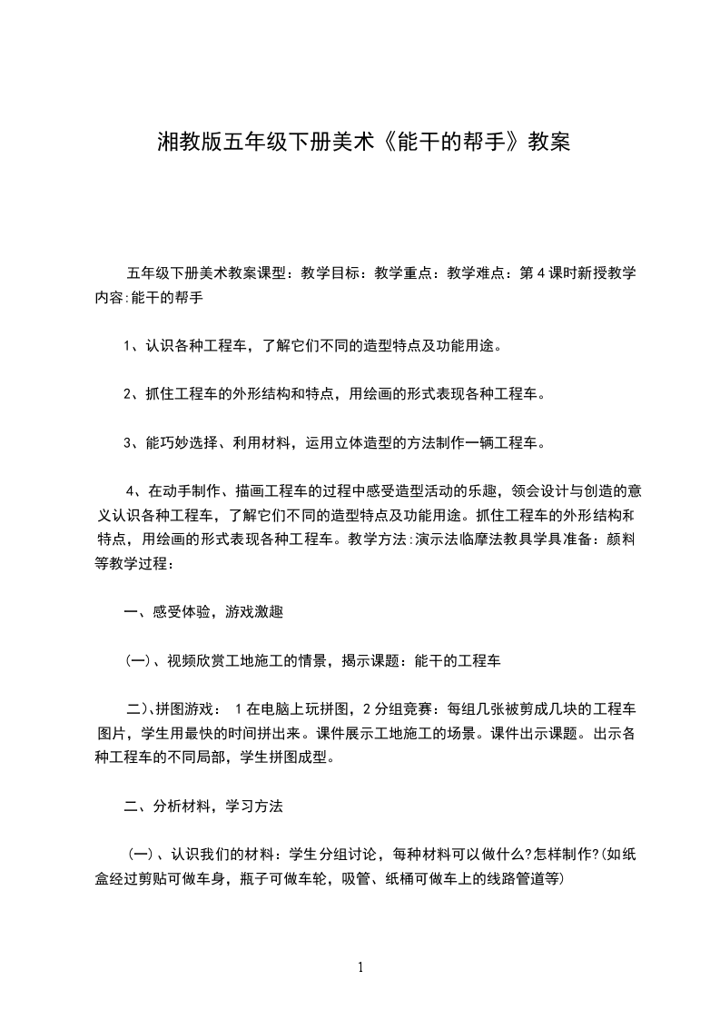 五年级下册美术教案课型:教学目标:教学重点:教学难点:第4课时新授教学内容:能干的帮手