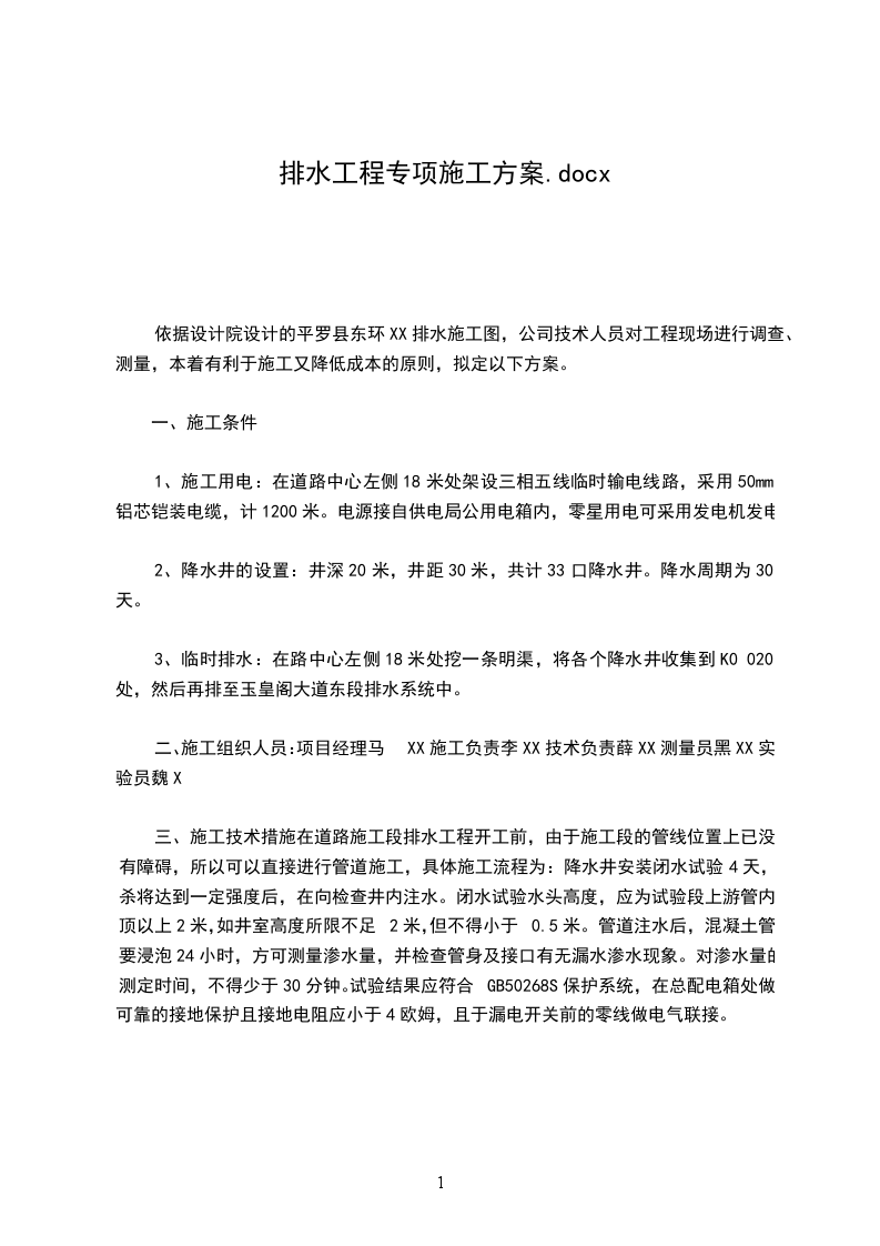 三、施工技术措施在道路施工段排水工程开工前,由于施工段的管线位置上已没有障碍,所以可以直接进行管道施工,具体施工流程为:降水井安装闭水试验4天,杀将达到一定强度后,在向检查井内注水。闭水试验水头高度,应为试验段上游管内顶以上2米,如井室高度所限不足2米,但不得小于0.5米。管道注水后,混凝土管要浸泡24小时,方可测量渗水量,并检查管身及接口有无漏水渗水现象。对渗水量的测定时间,不得少于30分钟。试验结果应符合GB50268S保护系统,在总配电箱处做可靠的接地保护且接地电阻应小于4欧姆,且于漏电开关前的零线做电气联接。