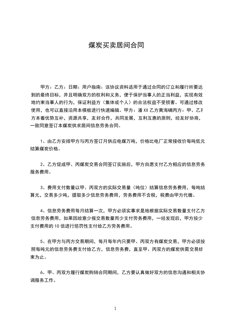 5、在甲方与丙方交易期间,每月每年内只要甲、丙双方有煤炭交易,甲方必须按照每吨元的信息劳务费支付给乙方,信息劳务费,直至甲、丙双方的煤炭供需交易结束为止。