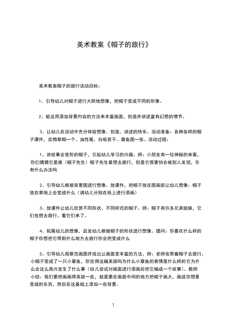 6、幼儿作画,教师指导。教师提出作画要求,提醒幼儿在作画的过程中,要保持画面的清洁和美观,比例要协调,在指定的时间内完成作品内容。师:小朋友你也来试试,带着你喜欢的帽子去旅行吧!画完后我们一起来讲讲帽子的旅行的故事吧!