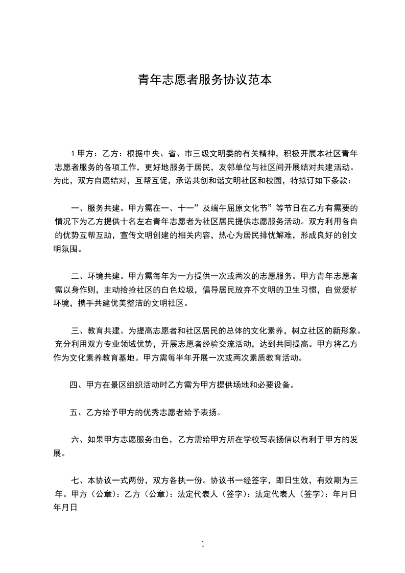 二、环境共建。甲方需每年为一方提供一次或两次的志愿服务。甲方青年志愿者需以身作则,主动拾捡社区的白色垃圾,倡导居民放弃不文明的卫生习惯,自觉爱护环境,携手共建优美整洁的文明社区。