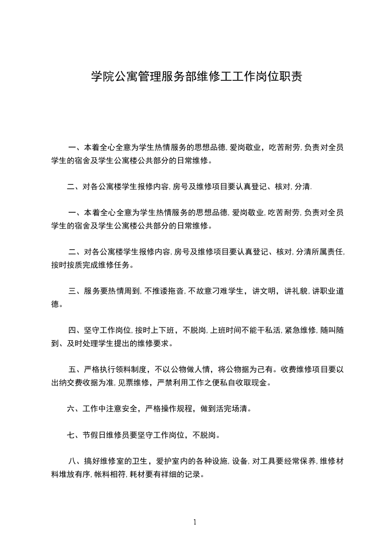 一、本着全心全意为学生热情服务的思想品德,爱岗敬业,吃苦耐劳,负责对全员学生的宿舍及学生公寓楼公共部分的日常维修。
