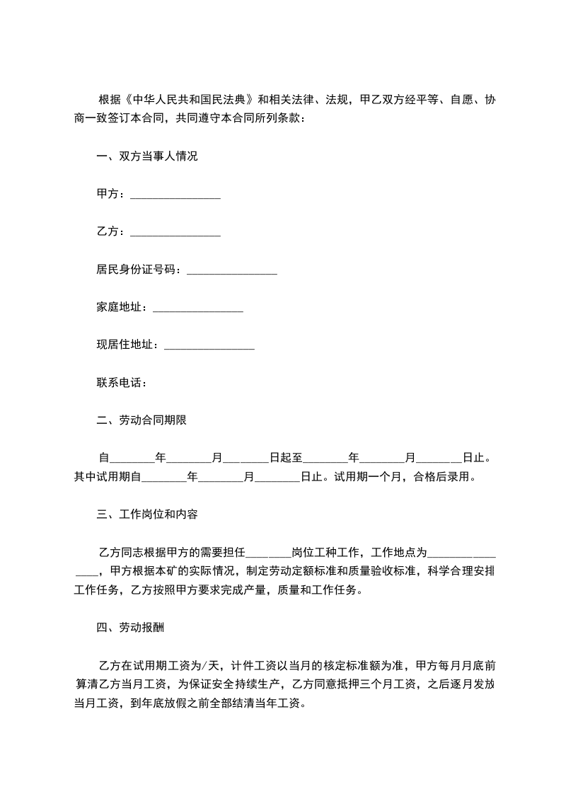 三、工作岗位和内容乙方同志根据甲方的需要担任岗位工种工作,工作地点为,甲方根据本矿的实际情况,制定劳动定额标准和质量验收标准,科学合理安排工作任务,乙方按照甲方要求完成产量,质量和工作任务。