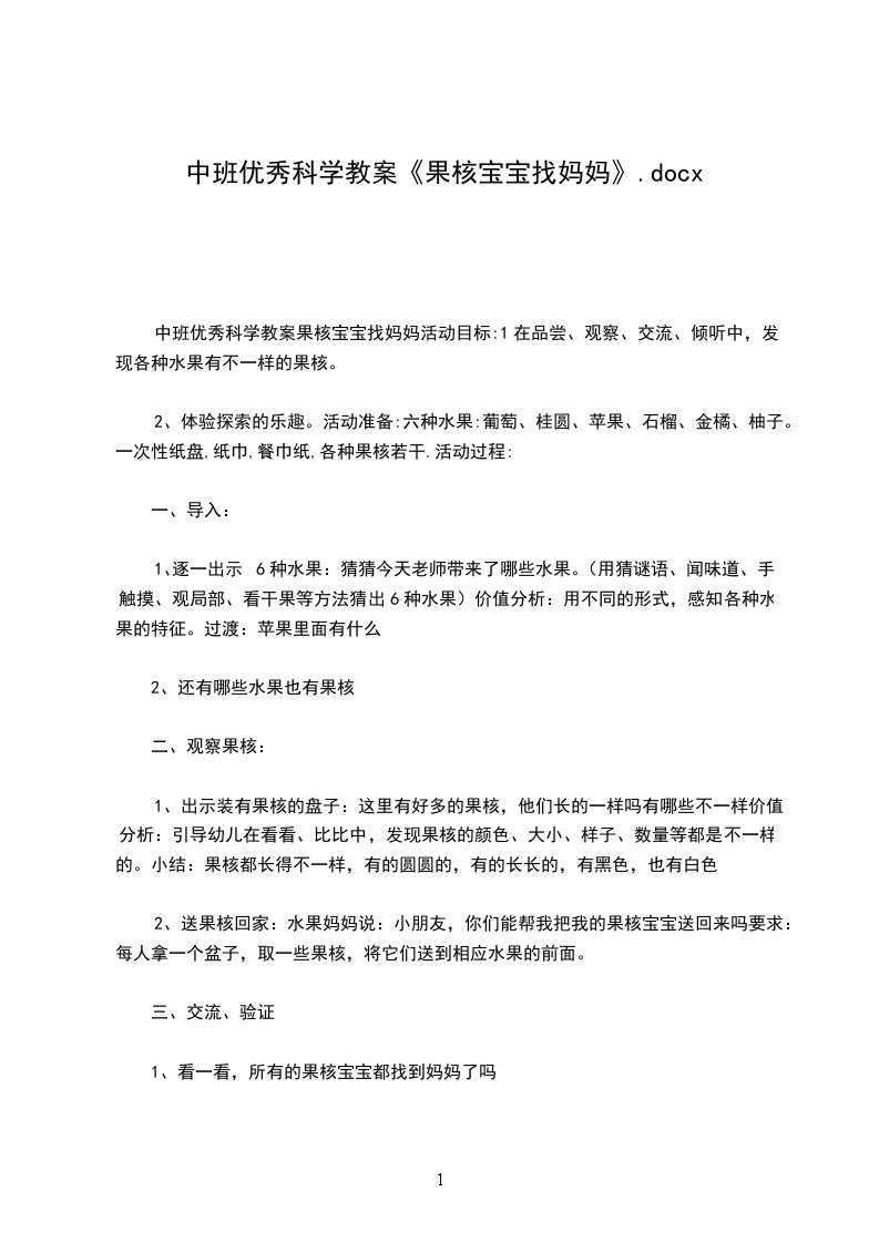 中班优秀科学教案果核宝宝找妈妈活动目标:1在品尝、观察、交流、倾听中,发现各种水果有不一样的果核。