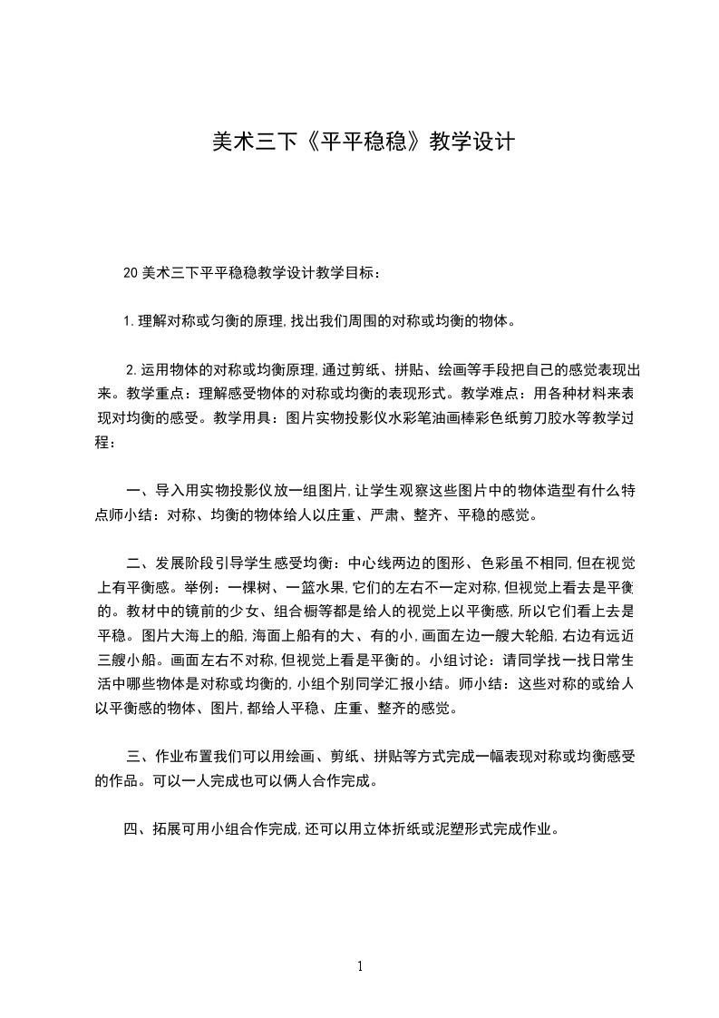 20美术三下平平稳稳教学设计教学目标:
