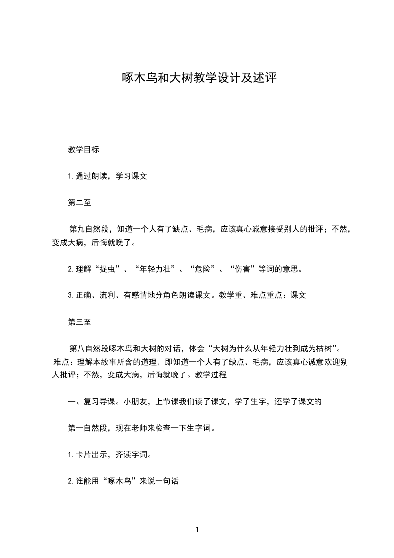 第八自然段啄木鸟和大树的对话,体会“大树为什么从年轻力壮到成为枯树”。难点:理解本故事所含的道理,即知道一个人有了缺点、毛病,应该真心诚意欢迎别人批评;不然,变成大病,后悔就晚了。教学过程