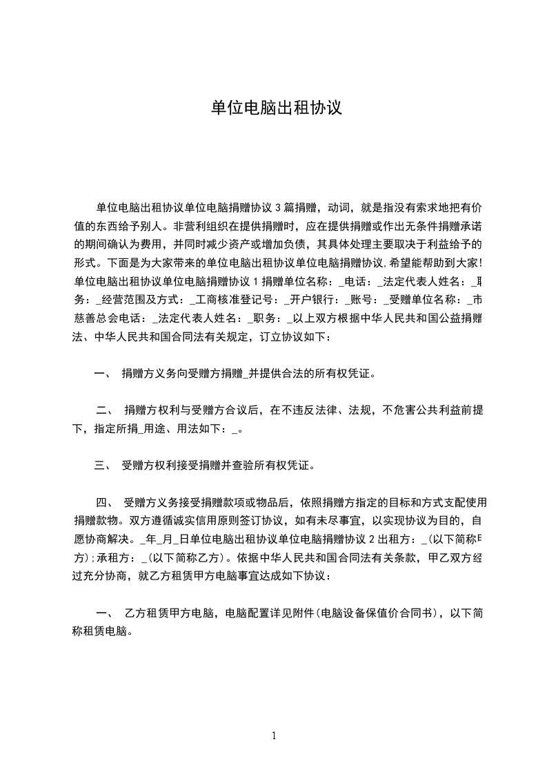 四、 受赠方义务接受捐赠款项或物品后,依照捐赠方指定的目标和方式支配使用捐赠款物。双方遵循诚实信用原则签订协议,如有未尽事宜,以实现协议为目的,自愿协商解决。_年_月_日单位电脑出租协议单位电脑捐赠协议2出租方:_(以下简称甲方);承租方:_(以下简称乙方)。依据中华人民共和国合同法有关条款,甲乙双方经过充分协商,就乙方租赁甲方电脑事宜达成如下协议: