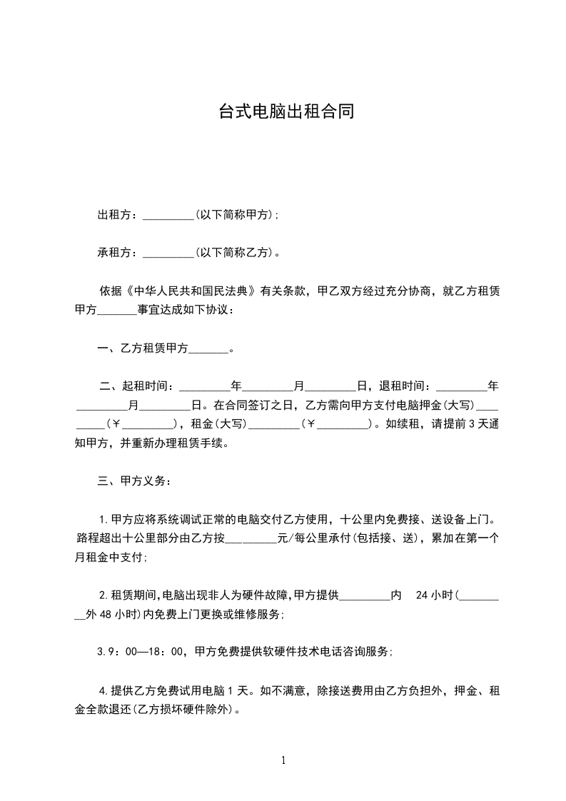 三、 甲方义务:1.甲方应将系统调试正常的电脑交付乙方使用,十公里内接、送设备上门。路程超出十公里部分由乙方按_元/每公里承付(包括接、送),累加在第一个月租金中支付;2.租赁期间,电脑出现非人为硬件故障,甲方提供_内24小时(_外48小时)内上门更换或维修服务;3.9:00-18:00,甲方提供软硬件技术电话咨询服务;4.提供乙方试用电脑1天。如不满意,除接送费用由乙方负担外,押金、租金全款退还(乙方损坏硬件除外)。