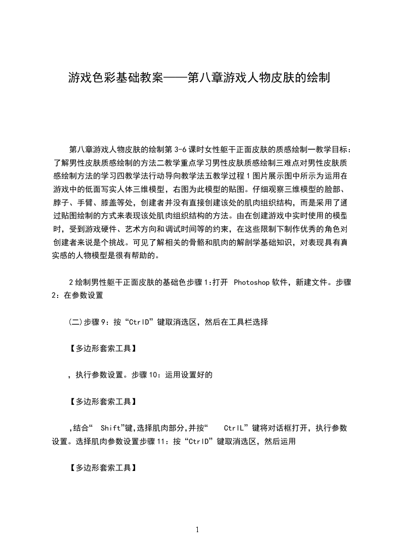 第八章游戏人物皮肤的绘制第3-6课时女性躯干正面皮肤的质感绘制一教学目标:了解男性皮肤质感绘制的方法二教学重点学习男性皮肤质感绘制三难点对男性皮肤质感绘制方法的学习四教学法行动导向教学法五教学过程1图片展示图中所示为运用在游戏中的低面写实人体三维模型,右图为此模型的贴图。仔细观察三维模型的脸部、脖子、手臂、膝盖等处,创建者并没有直接创建该处的肌肉组织结构,而是采用了通过贴图绘制的方式来表现该处肌肉组织结构的方法。由在创建游戏中实时使用的模型时,受到游戏硬件、艺术方向和调试时间等的约束,在这些限制下制作优秀的角色对创建者来说是个挑战。可见了解相关的骨骼和肌肉的解剖学基础知识,对表现具有真实感的人物模型是很有帮助的。