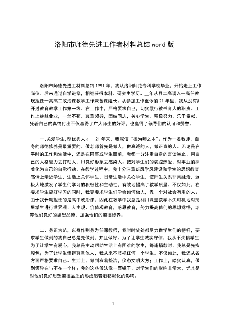 一、关爱学生,塑优秀人才21年来,我深信“德为师之本”。作为一名教师,自身的师德修养是最重要的。做老师首先是做人,做真诚的人,做正直的人。无论是在平时的工作和生活中,还是在同事或学生面前,我都十分注重自身的言谈举止,用自己的人格魅力去打动人,用良好形象去感染人。把对学生们的满腔热爱,对事业的执着化为自己的自觉行动。在教学过程中,我十分注重班风学风建设和学生的思想教育。感情上亲近学生,生活上关怀学生,日常生活中关心学生,使师生关系非常融洽,这极大地激发了学生们学习的积极性和主动性,有效地提高了教学质量。不仅如此,在要求学生搞好学习的同时,我更要求学生们学会如何做人,做一个对.有用的人。由于我长期担任的是高中政治课,因此在教学中我总是利用课堂教学不失时机地对班里学生进行世界观、人生观、价值观教育,感恩教育,努力提高他们的思想觉悟,培养他们良好的思想品德,加强他们的道德修养。